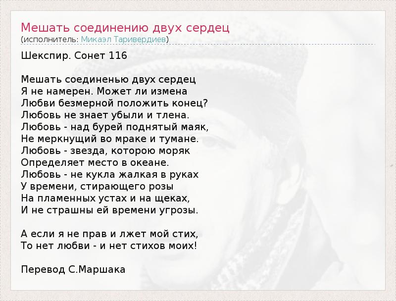 Шекспир. Сонет 116 Мешать соединенью двух сердец Я не намерен. Может ли измена Любви безмерной положить конец? Любовь не знает убыли и тлена. Любовь - над бурей поднятый маяк, Не меркнущий во мраке и тумане. Любовь - звезда, которою моряк Определяет место в океане. Любовь - не кукла жалкая в руках У времени, стирающего розы На пламенных устах и на щеках, И не страшны ей времени угрозы. А если я не прав и лжет мой стих, То нет любви - и нет стихов моих! Перевод С.Маршака