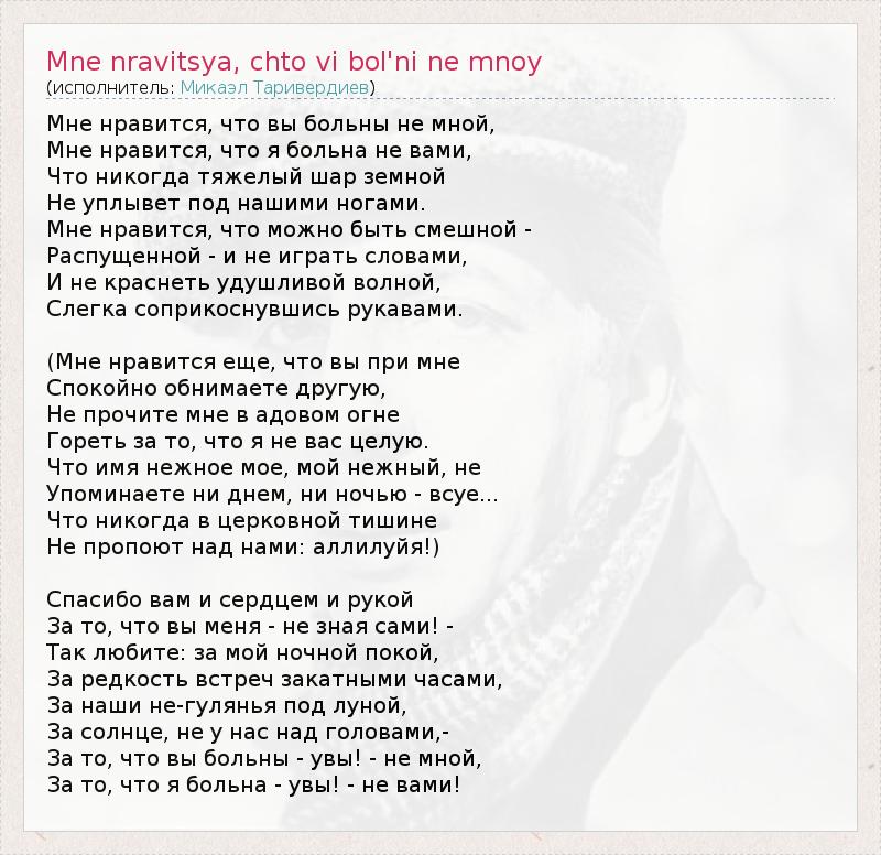 А как ты думаешь, о чем песня "Mne nravitsya, chto vi bol'ni ne mnoy" ?