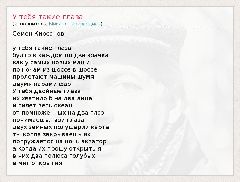 Семен Кирсанов у тебя такие глаза будто в каждом по два зрачка как у самых новых машин по ночам из шоссе в шоссе пролетают машины шумя двумя парами фар У тебя двойные глаза их хватило б на два лица и сияет весь океан от помноженных на два глаз понимаешь,твои глаза двух земных полушарий карта ты когда закрываешь их погружается на ночь экватор а когда их прошу открыть я в них два полюса голубых в миг открытия