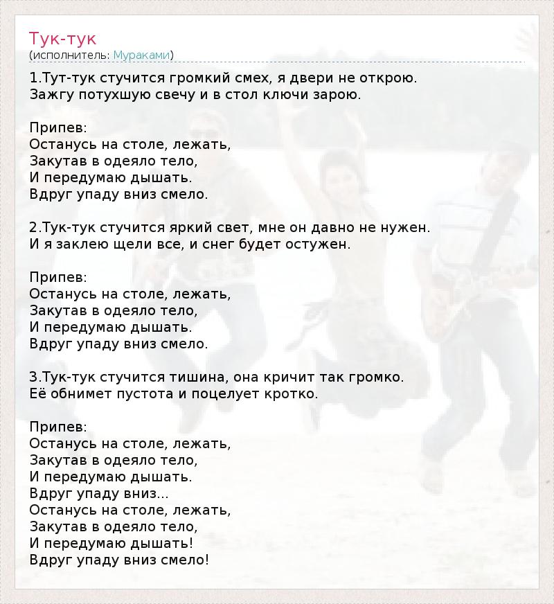 1.Тут-тук стучится громкий смех, я двери не открою. Зажгу потухшую свечу и в стол ключи зарою. Припев: Останусь на столе, лежать, Закутав в одеяло тело, И передумаю дышать. Вдруг упаду вниз смело. 2.Тук-тук стучится яркий свет, мне он давно не нужен. И я заклею щели все, и снег будет остужен. Припев: Останусь на столе, лежать, Закутав в одеяло тело, И передумаю дышать. Вдруг упаду вниз смело. 3.Тук-тук стучится тишина, она кричит так громко. Её обнимет пустота и поцелует кротко. Припев: Останусь на столе, лежать, Закутав в одеяло тело, И передумаю дышать. Вдруг упаду вниз... Останусь на столе, лежать, Закутав в одеяло тело, И передумаю дышать! Вдруг упаду вниз смело!