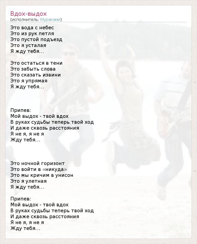 Это вода с небес Это из рук петля Это пустой подъезд Это я усталая Я жду тебя… Это остаться в тени Это забыть слова Это сказать извини Это я упрямая Я жду тебя… Припев: Мой выдох - твой вдох В руках судьбы теперь твой ход И даже сквозь расстояния Я не я, я не я Жду тебя… Это ночной горизонт Это войти в «никуда» Это мы кричим в унисон Это я улетная Я жду тебя… Припев: Мой выдох - твой вдох В руках судьбы теперь твой ход И даже сквозь расстояния Я не я, я не я Жду тебя…
