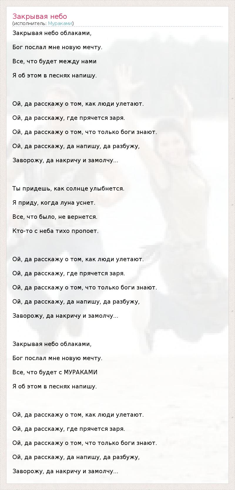 Закрывая небо облаками, Бог послал мне новую мечту. Все, что будет между нами Я об этом в песнях напишу. Ой, да расскажу о том, как люди улетают. Ой, да расскажу, где прячется заря. Ой, да расскажу о том, что только боги знают. Ой, да расскажу, да напишу, да разбужу, Заворожу, да накричу и замолчу... Ты придешь, как солнце улыбнется. Я приду, когда луна уснет. Все, что было, не вернется. Кто-то с неба тихо пропоет. Ой, да расскажу о том, как люди улетают. Ой, да расскажу, где прячется заря. Ой, да расскажу о том, что только боги знают. Ой, да расскажу, да напишу, да разбужу, Заворожу, да накричу и замолчу... Закрывая небо облаками, Бог послал мне новую мечту. Все, что будет с МУРАКАМИ Я об этом в песнях напишу. Ой, да расскажу о том, как люди улетают. Ой, да расскажу, где прячется заря. Ой, да расскажу о том, что только боги знают. Ой, да расскажу, да напишу, да разбужу, Заворожу, да накричу и замолчу...