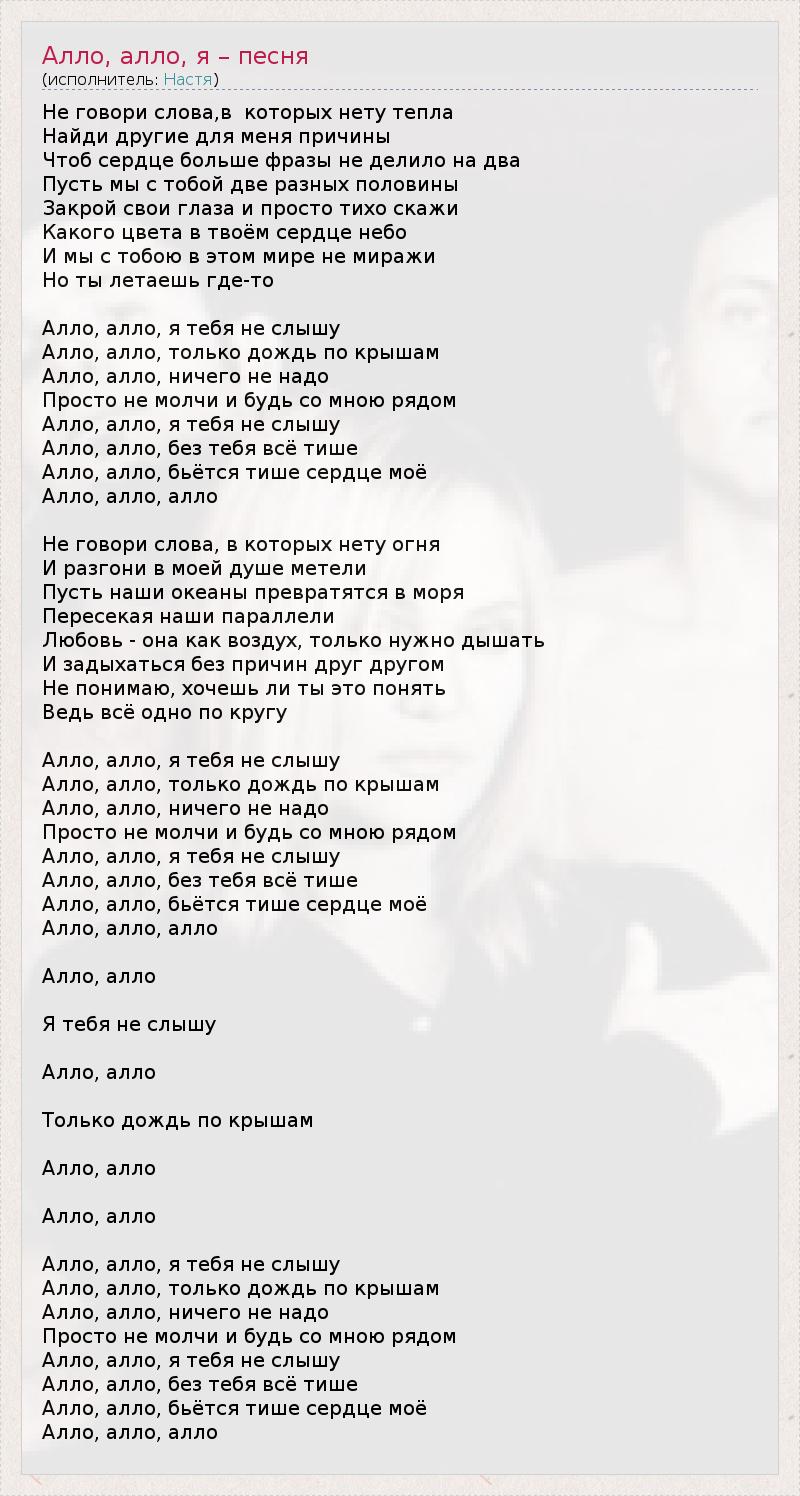 Не говори слова,в которых нету тепла Найди другие для меня причины Чтоб сердце больше фразы не делило на два Пусть мы с тобой две разных половины Закрой свои глаза и просто тихо скажи Какого цвета в твоём сердце небо И мы с тобою в этом мире не миражи Но ты летаешь где-то Алло, алло, я тебя не слышу Алло, алло, только дождь по крышам Алло, алло, ничего не надо Просто не молчи и будь со мною рядом Алло, алло, я тебя не слышу Алло, алло, без тебя всё тише Алло, алло, бьётся тише сердце моё Алло, алло, алло Не говори слова, в которых нету огня И разгони в моей душе метели Пусть наши океаны превратятся в моря Пересекая наши параллели Любовь - она как воздух, только нужно дышать И задыхаться без причин друг другом Не понимаю, хочешь ли ты это понять Ведь всё одно по кругу Алло, алло, я тебя не слышу Алло, алло, только дождь по крышам Алло, алло, ничего не надо Просто не молчи и будь со мною рядом Алло, алло, я тебя не слышу Алло, алло, без тебя всё тише Алло, алло, бьётся тише сердце моё Алло, алло, алло Алло, алло Я тебя не слышу Алло, алло Только дождь по крышам Алло, алло Алло, алло Алло, алло, я тебя не слышу Алло, алло, только дождь по крышам Алло, алло, ничего не надо Просто не молчи и будь со мною рядом Алло, алло, я тебя не слышу Алло, алло, без тебя всё тише Алло, алло, бьётся тише сердце моё Алло, алло, алло