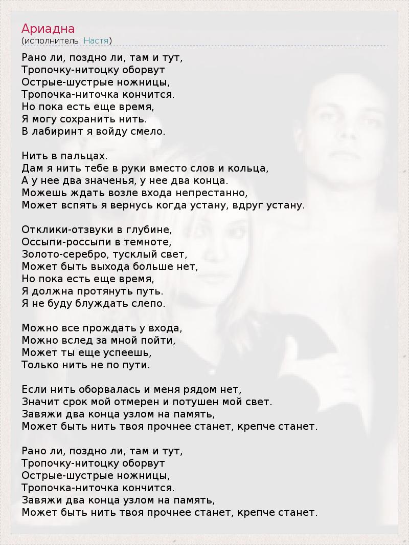 Рано ли, поздно ли, там и тут, Тропочку-нитоцку оборвут Острые-шустрые ножницы, Тропочка-ниточка кончится. Но пока есть еще время, Я могу сохранить нить. В лабиринт я войду смело. Нить в пальцах. Дам я нить тебе в руки вместо слов и кольца, А у нее два значенья, у нее два конца. Можешь ждать возле входа непрестанно, Может вспять я вернусь когда устану, вдруг устану. Отклики-отзвуки в глубине, Оссыпи-россыпи в темноте, Золото-серебро, тусклый свет, Может быть выхода больше нет, Но пока есть еще время, Я должна протянуть путь. Я не буду блуждать слепо. Можно все прождать у входа, Можно вслед за мной пойти, Может ты еще успеешь, Только нить не по пути. Если нить оборвалась и меня рядом нет, Значит срок мой отмерен и потушен мой свет. Завяжи два конца узлом на память, Может быть нить твоя прочнее станет, крепче станет. Рано ли, поздно ли, там и тут, Тропочку-нитоцку оборвут Острые-шустрые ножницы, Тропочка-ниточка кончится. Завяжи два конца узлом на память, Может быть нить твоя прочнее станет, крепче станет.