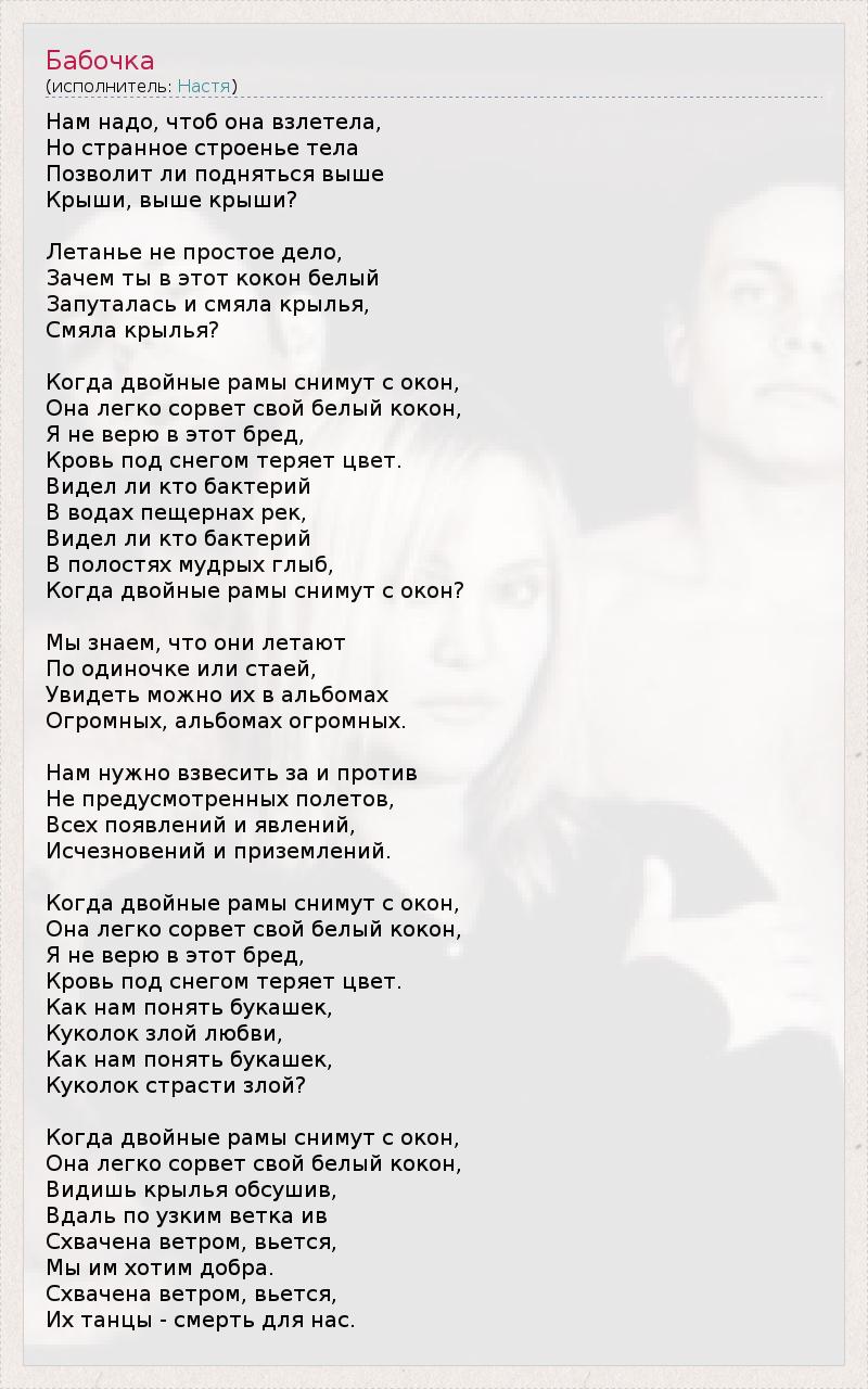 Нам надо, чтоб она взлетела, Но странное строенье тела Позволит ли подняться выше Крыши, выше крыши? Летанье не простое дело, Зачем ты в этот кокон белый Запуталась и смяла крылья, Смяла крылья? Когда двойные рамы снимут с окон, Она легко сорвет свой белый кокон, Я не верю в этот бред, Кровь под снегом теряет цвет. Видел ли кто бактерий В водах пещернах рек, Видел ли кто бактерий В полостях мудрых глыб, Когда двойные рамы снимут с окон? Мы знаем, что они летают По одиночке или стаей, Увидеть можно их в альбомах Огромных, альбомах огромных. Нам нужно взвесить за и против Не предусмотренных полетов, Всех появлений и явлений, Исчезновений и приземлений. Когда двойные рамы снимут с окон, Она легко сорвет свой белый кокон, Я не верю в этот бред, Кровь под снегом теряет цвет. Как нам понять букашек, Куколок злой любви, Как нам понять букашек, Куколок страсти злой? Когда двойные рамы снимут с окон, Она легко сорвет свой белый кокон, Видишь крылья обсушив, Вдаль по узким ветка ив Схвачена ветром, вьется, Мы им хотим добра. Схвачена ветром, вьется, Их танцы - смерть для нас.