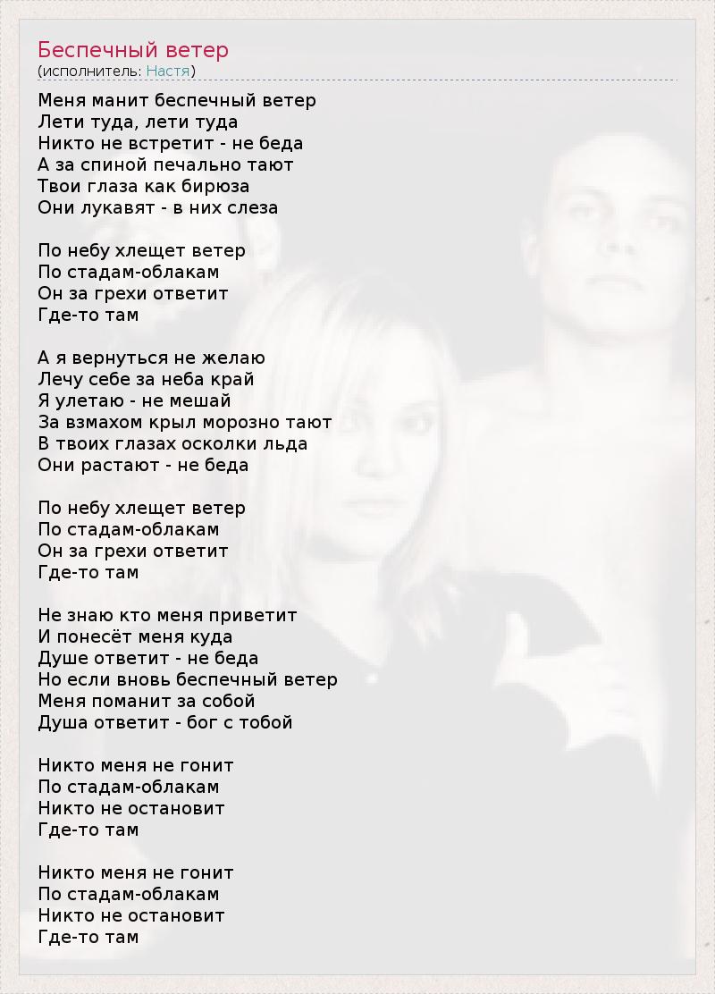 Меня манит беспечный ветер Лети туда, лети туда Никто не встретит - не беда А за спиной печально тают Твои глаза как бирюза Они лукавят - в них слеза По небу хлещет ветер По стадам-облакам Он за грехи ответит Где-то там А я вернуться не желаю Лечу себе за неба край Я улетаю - не мешай За взмахом крыл морозно тают В твоих глазах осколки льда Они растают - не беда По небу хлещет ветер По стадам-облакам Он за грехи ответит Где-то там Не знаю кто меня приветит И понесёт меня куда Душе ответит - не беда Но если вновь беспечный ветер Меня поманит за собой Душа ответит - бог с тобой Никто меня не гонит По стадам-облакам Никто не остановит Где-то там Никто меня не гонит По стадам-облакам Никто не остановит Где-то там