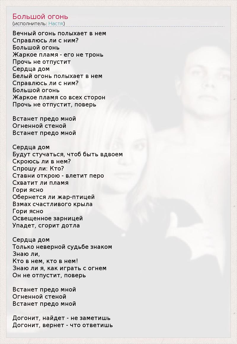 Вечный огонь полыхает в нем Справлюсь ли с ним? Большой огонь Жаркое пламя - его не тронь Прочь не отпустит Сердца дом Белый огонь полыхает в нем Справлюсь ли с ним? Большой огонь Жаркое пламя со всех сторон Прочь не отпустит, поверь Встанет предо мной Огненной стеной Встанет предо мной Сердца дом Будут стучаться, чтоб быть вдвоем Скроюсь ли в нем? Спрошу ли: Кто? Ставни открою - влетит перо Схватит ли пламя Гори ясно Обернется ли жар-птицей Взмах счастливого крыла Гори ясно Освещенное зарницей Упадет, сгорит дотла Сердца дом Только неверной судьбе знаком Знаю ли, Кто в нем, кто в нем! Знаю ли я, как играть с огнем Он не отпустит, поверь Встанет предо мной Огненной стеной Встанет предо мной Догонит, найдет - не заметишь Догонит, вернет - что ответишь