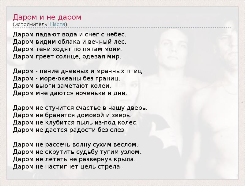 Даром падают вода и снег с небес. Даром видим облака и вечный лес. Даром тени ходят по пятам моим. Даром греет солнце, одевая мир. Даром - пение дневных и мрачных птиц. Даром - море-океаны без границ. Даром вьюги заметают колеи. Даром мне даются ноченьки и дни. Даром не стучится счастье в нашу дверь. Даром не бранятся домовой и зверь. Даром не клубится пыль из-под колес. Даром не дается радости без слез. Даром не рассечь волну сухим веслом. Даром не скрутить судьбу тугим узлом. Даром не лететь не развернув крыла. Даром не настигнет цель стрела.