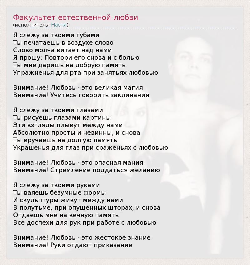Я слежу за твоими губами Ты печатаешь в воздухе слово Слово молча витает над нами Я прошу: Повтори его снова и с болью Ты мне даришь на добрую память Упражненья для рта при занятьях любовью Внимание! Любовь - это великая магия Внимание! Учитесь говорить заклинания Я слежу за твоими глазами Ты рисуешь глазами картины Эти взгляды плывут между нами Абсолютно просты и невинны, и снова Ты вручаешь на долгую память Украшенья для глаз при сраженьях с любовью Внимание! Любовь - это опасная мания Внимание! Стремление поддаться желанию Я слежу за твоими руками Ты ваяешь безумные формы И скульптуры живут между нами В полутьме, при опущенных шторах, и снова Отдаешь мне на вечную память Все доспехи для рук при работе с любовью Внимание! Любовь - это жестокое знание Внимание! Руки отдают приказание