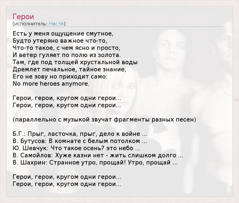 Есть у меня ощущение смутное, Будто утеряно важное что-то, Что-то такое, с чем ясно и просто, И ветер гуляет по полю из золота. Там, где под толщей хрустальной воды Дремлет печальное, тайное знание, Его не зову но приходит само: No more heroes anymore. Герои, герои, кругом одни герои... Герои, герои, кругом одни герои... (параллельно с музыкой звучат фрагменты разных песен) Б.Г.: Прыг, ласточка, прыг, дело к войне ... В. Бутусов: В комнате с белым потолком ... Ю. Шевчук: Что такое осень? это небо ... В. Самойлов: Хуже казни нет - жить слишком долго ... В. Шахрин: Странное утро, прощай! Утро, прощай ... Герои, герои, кругом одни герои... Герои, герои, кругом одни герои...