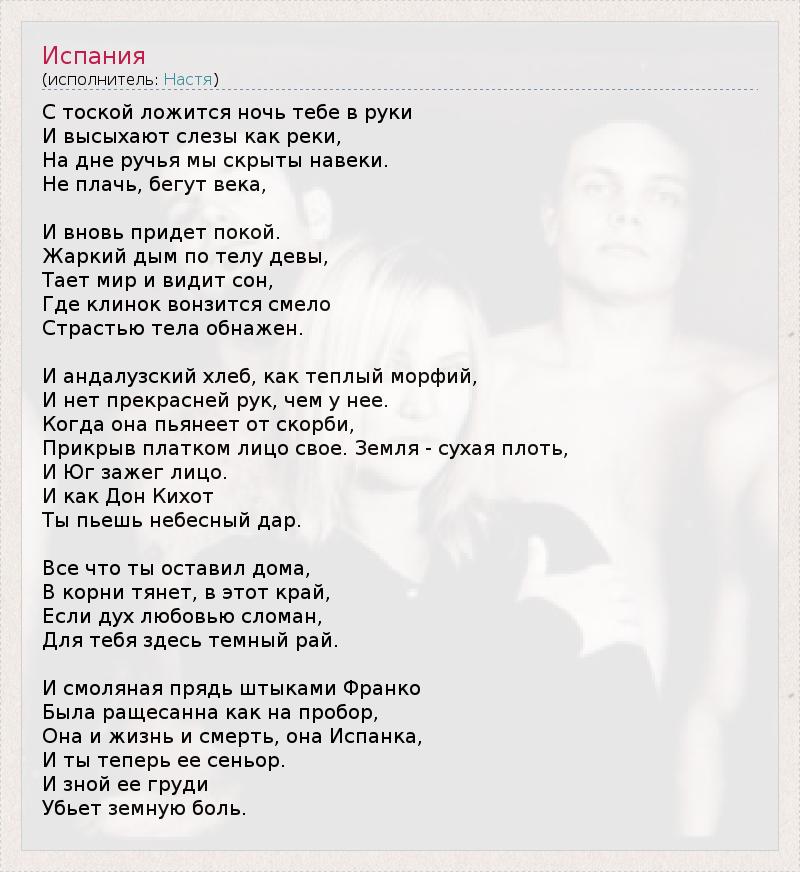 С тоской ложится ночь тебе в руки И высыхают слезы как реки, На дне ручья мы скрыты навеки. Не плачь, бегут века, И вновь придет покой. Жаркий дым по телу девы, Тает мир и видит сон, Где клинок вонзится смело Страстью тела обнажен. И андалузский хлеб, как теплый морфий, И нет прекрасней рук, чем у нее. Когда она пьянеет от скорби, Прикрыв платком лицо свое. Земля - сухая плоть, И Юг зажег лицо. И как Дон Кихот Ты пьешь небесный дар. Все что ты оставил дома, В корни тянет, в этот край, Если дух любовью сломан, Для тебя здесь темный рай. И смоляная прядь штыками Франко Была ращесанна как на пробор, Она и жизнь и смерть, она Испанка, И ты теперь ее сеньор. И зной ее груди Убьет земную боль.