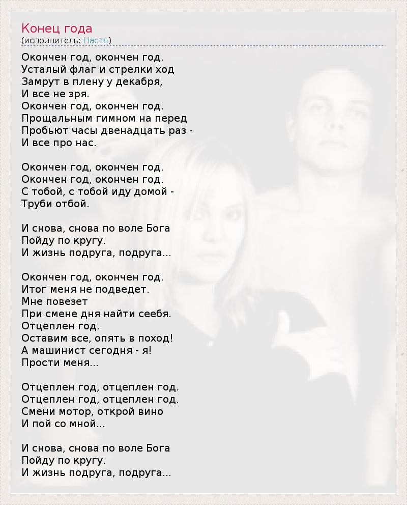 Окончен год, окончен год. Усталый флаг и стрелки ход Замрут в плену у декабря, И все не зря. Окончен год, окончен год. Прощальным гимном на перед Пробьют часы двенадцать раз - И все про нас. Окончен год, окончен год. Окончен год, окончен год. С тобой, с тобой иду домой - Труби отбой. И снова, снова по воле Бога Пойду по кругу. И жизнь подруга, подруга... Окончен год, окончен год. Итог меня не подведет. Мне повезет При смене дня найти сеебя. Отцеплен год. Оставим все, опять в поход! А машинист сегодня - я! Прости меня... Отцеплен год, отцеплен год. Отцеплен год, отцеплен год. Смени мотор, открой вино И пой со мной... И снова, снова по воле Бога Пойду по кругу. И жизнь подруга, подруга...