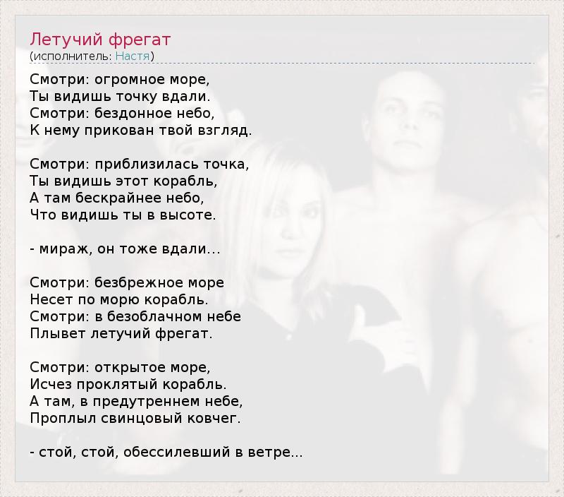 Смотри: огромное море, Ты видишь точку вдали. Смотри: бездонное небо, К нему прикован твой взгляд. Смотри: приблизилась точка, Ты видишь этот корабль, А там бескрайнее небо, Что видишь ты в высоте. - мираж, он тоже вдали… Смотри: безбрежное море Несет по морю корабль. Смотри: в безоблачном небе Плывет летучий фрегат. Смотри: открытое море, Исчез проклятый корабль. А там, в предутреннем небе, Проплыл свинцовый ковчег. - стой, стой, обессилевший в ветре...