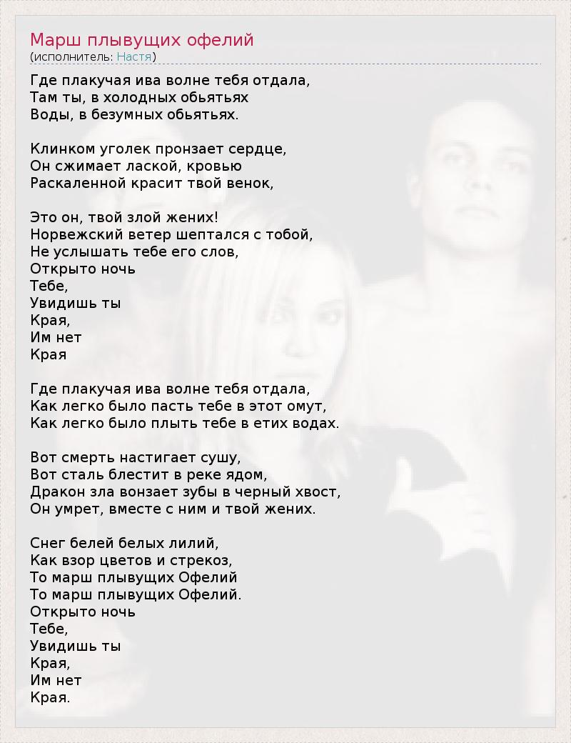 Где плакучая ива волне тебя отдала, Там ты, в холодных обьятьях Воды, в безумных обьятьях. Клинком уголек пронзает сердце, Он сжимает лаской, кровью Раскаленной красит твой венок, Это он, твой злой жених! Норвежский ветер шептался с тобой, Не услышать тебе его слов, Открыто ночь Тебе, Увидишь ты Края, Им нет Края Где плакучая ива волне тебя отдала, Как легко было пасть тебе в этот омут, Как легко было плыть тебе в етих водах. Вот смерть настигает сушу, Вот сталь блестит в реке ядом, Дракон зла вонзает зубы в черный хвост, Он умрет, вместе с ним и твой жених. Снег белей белых лилий, Как взор цветов и стрекоз, То марш плывущих Офелий То марш плывущих Офелий. Открыто ночь Тебе, Увидишь ты Края, Им нет Края.