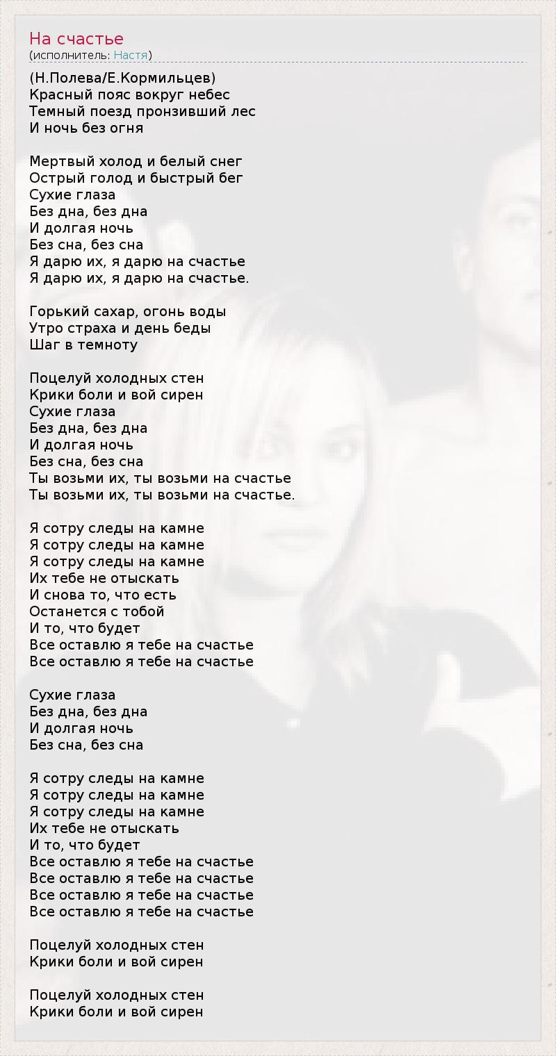 Это интересно:Настя Полева родилась в Свердловске(Екатеринбург) и впервые выступила в роли вокалистки хард-рок группы Трек в 1980. После этого она какое-то время выступала в группе Nautilus Pompilius и в 1986 начала писать собственную музыку. В 1986 записан первый альбом Тацу, музыкальный материал которого проникнут духом доселе неведомой советским гражданам экзотики. С тех пор группа часто... продолжение