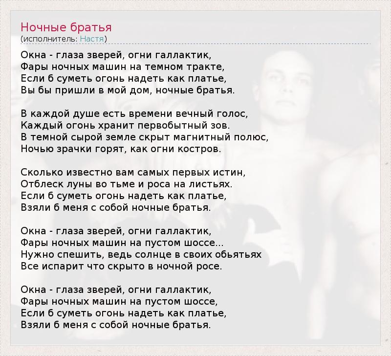 Окна - глаза зверей, огни галлактик, Фары ночных машин на темном тракте, Если б суметь огонь надеть как платье, Вы бы пришли в мой дом, ночные братья. В каждой душе есть времени вечный голос, Каждый огонь хранит первобытный зов. В темной сырой земле скрыт магнитный полюс, Ночью зрачки горят, как огни костров. Сколько известно вам самых первых истин, Отблеск луны во тьме и роса на листьях. Если б суметь огонь надеть как платье, Взяли б меня с собой ночные братья. Окна - глаза зверей, огни галлактик, Фары ночных машин на пустом шоссе... Нужно спешить, ведь солнце в своих обьятьях Все испарит что скрыто в ночной росе. Окна - глаза зверей, огни галлактик, Фары ночных машин на пустом шоссе, Если б суметь огонь надеть как платье, Взяли б меня с собой ночные братья.