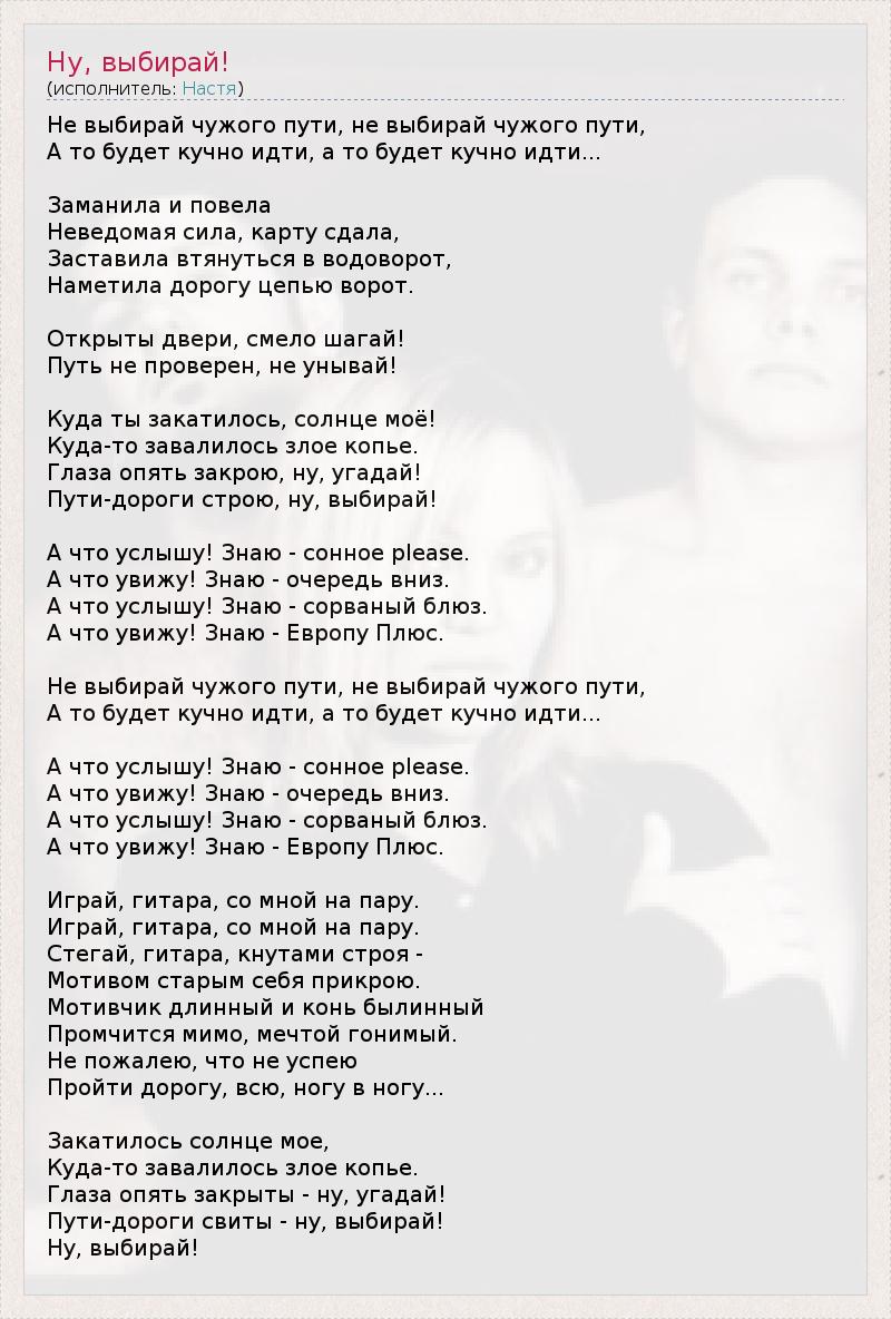 Не выбирай чужого пути, не выбирай чужого пути, А то будет кучно идти, а то будет кучно идти... Заманила и повела Неведомая сила, карту сдала, Заставила втянуться в водоворот, Наметила дорогу цепью ворот. Открыты двери, смело шагай! Путь не проверен, не унывай! Куда ты закатилось, солнце моё! Куда-то завалилось злое копье. Глаза опять закрою, ну, угадай! Пути-дороги строю, ну, выбирай! А что услышу! Знаю - сонное please. А что увижу! Знаю - очередь вниз. А что услышу! Знаю - сорваный блюз. А что увижу! Знаю - Европу Плюс. Не выбирай чужого пути, не выбирай чужого пути, А то будет кучно идти, а то будет кучно идти... А что услышу! Знаю - сонное please. А что увижу! Знаю - очередь вниз. А что услышу! Знаю - сорваный блюз. А что увижу! Знаю - Европу Плюс. Играй, гитара, со мной на пару. Играй, гитара, со мной на пару. Стегай, гитара, кнутами строя - Мотивом старым себя прикрою. Мотивчик длинный и конь былинный Промчится мимо, мечтой гонимый. Не пожалею, что не успею Пройти дорогу, всю, ногу в ногу... Закатилось солнце мое, Куда-то завалилось злое копье. Глаза опять закрыты - ну, угадай! Пути-дороги свиты - ну, выбирай! Ну, выбирай!