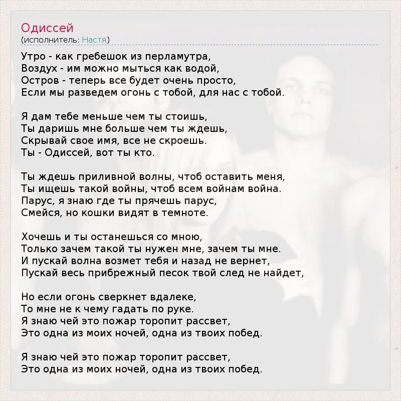 Утро - как гребешок из перламутра, Воздух - им можно мыться как водой, Остров - теперь все будет очень просто, Если мы разведем огонь с тобой, для нас с тобой. Я дам тебе меньше чем ты стоишь, Ты даришь мне больше чем ты ждешь, Скрывай свое имя, все не скроешь. Ты - Одиссей, вот ты кто. Ты ждешь приливной волны, чтоб оставить меня, Ты ищешь такой войны, чтоб всем войнам война. Парус, я знаю где ты прячешь парус, Смейся, но кошки видят в темноте. Хочешь и ты останешься со мною, Только зачем такой ты нужен мне, зачем ты мне. И пускай волна возмет тебя и назад не вернет, Пускай весь прибрежный песок твой след не найдет, Но если огонь сверкнет вдалеке, То мне не к чему гадать по руке. Я знаю чей это пожар торопит рассвет, Это одна из моих ночей, одна из твоих побед. Я знаю чей это пожар торопит рассвет, Это одна из моих ночей, одна из твоих побед.