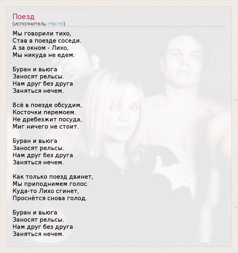Мы говорили тихо, Став в поезде соседи. А за окном - Лихо, Мы никуда не едем. Буран и вьюга Заносят рельсы. Нам друг без друга Заняться нечем. Всё в поезде обсудим, Косточки перемоем. Не дребезжит посуда, Миг ничего не стоит. Буран и вьюга Заносят рельсы. Нам друг без друга Заняться нечем. Как только поезд двинет, Мы приподнимем голос. Куда-то Лихо сгинет, Проснётся снова голод. Буран и вьюга Заносят рельсы. Нам друг без друга Заняться нечем.
