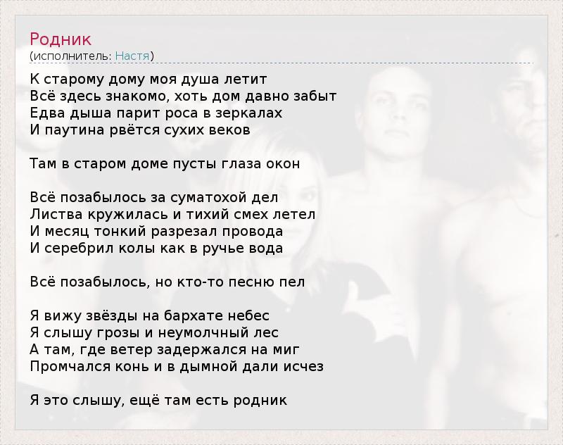 К старому дому моя душа летит Всё здесь знакомо, хоть дом давно забыт Едва дыша парит роса в зеркалах И паутина рвётся сухих веков Там в старом доме пусты глаза окон Всё позабылось за суматохой дел Листва кружилась и тихий смех летел И месяц тонкий разрезал провода И серебрил колы как в ручье вода Всё позабылось, но кто-то песню пел Я вижу звёзды на бархате небес Я слышу грозы и неумолчный лес А там, где ветер задержался на миг Промчался конь и в дымной дали исчез Я это слышу, ещё там есть родник