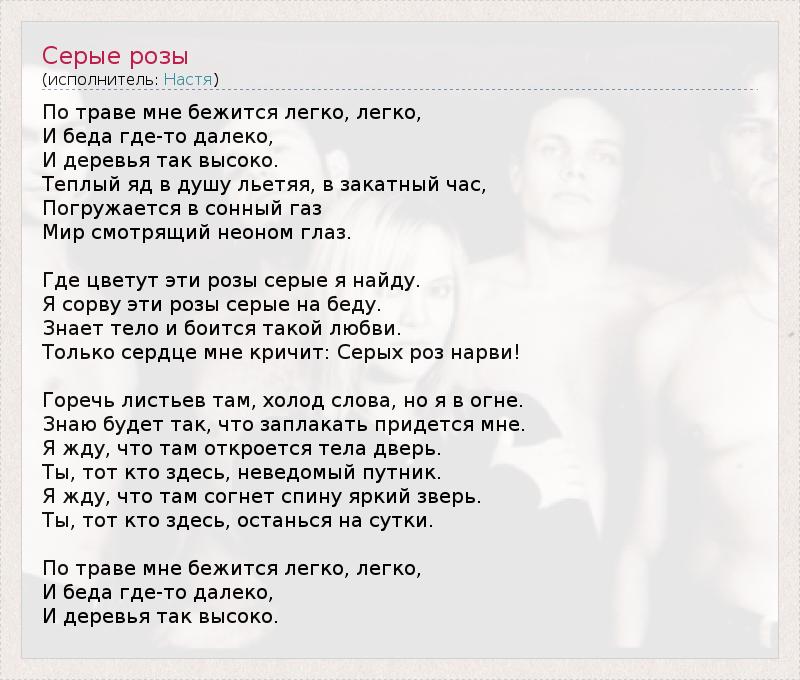 По траве мне бежится легко, легко, И беда где-то далеко, И деревья так высоко. Теплый яд в душу льетяя, в закатный час, Погружается в сонный газ Мир смотрящий неоном глаз. Где цветут эти розы серые я найду. Я сорву эти розы серые на беду. Знает тело и боится такой любви. Только сердце мне кричит: Серых роз нарви! Горечь листьев там, холод слова, но я в огне. Знаю будет так, что заплакать придется мне. Я жду, что там откроется тела дверь. Ты, тот кто здесь, неведомый путник. Я жду, что там согнет спину яркий зверь. Ты, тот кто здесь, останься на сутки. По траве мне бежится легко, легко, И беда где-то далеко, И деревья так высоко.
