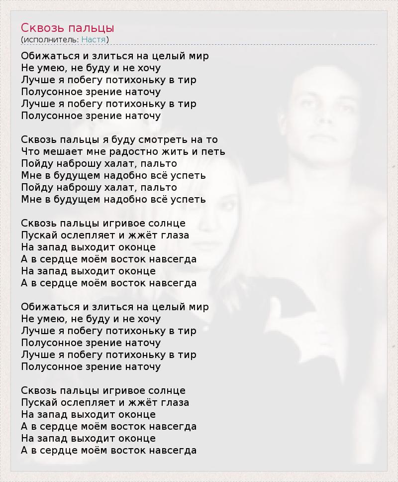 Обижаться и злиться на целый мир Не умею, не буду и не хочу Лучше я побегу потихоньку в тир Полусонное зрение наточу Лучше я побегу потихоньку в тир Полусонное зрение наточу Сквозь пальцы я буду смотреть на то Что мешает мне радостно жить и петь Пойду наброшу халат, пальто Мне в будущем надобно всё успеть Пойду наброшу халат, пальто Мне в будущем надобно всё успеть Сквозь пальцы игривое солнце Пускай ослепляет и жжёт глаза На запад выходит оконце А в сердце моём восток навсегда На запад выходит оконце А в сердце моём восток навсегда Обижаться и злиться на целый мир Не умею, не буду и не хочу Лучше я побегу потихоньку в тир Полусонное зрение наточу Лучше я побегу потихоньку в тир Полусонное зрение наточу Сквозь пальцы игривое солнце Пускай ослепляет и жжёт глаза На запад выходит оконце А в сердце моём восток навсегда На запад выходит оконце А в сердце моём восток навсегда