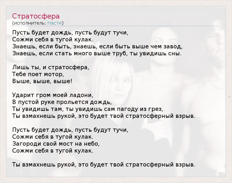 Пусть будет дождь, пусть будут тучи, Сожми себя в тугой кулак. Знаешь, если быть, знаешь, если быть выше чем завод, Знаешь, если стать много выше труб, ты увидишь сны. Лишь ты, и стратосфера, Тебе поет мотор, Выше, выше, выше! Ударит гром моей ладони, В пустой руке прольется дождь, Ты увидишь там, ты увидишь сам пагоду из грез, Ты взмахнешь рукой, это будет твой стратосферный взрыв. Пусть будет дождь, пусть будут тучи, Сожми себя в тугой кулак. Загороди свой мост на небо, Сожми себя в тугой кулак. Ты взмахнешь рукой, это будет твой стратосферный взрыв.
