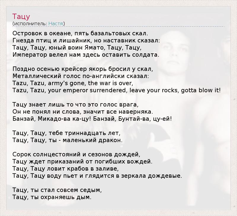 Островок в океане, пять базальтовых скал. Гнезда птиц и лишайник, но наставник сказал: Тацу, Тацу, юный воин Ямато, Тацу, Тацу, Император велел нам здесь оставить солдата. Поздно осенью крейсер якорь бросил у скал, Металлический голос по-английски сказал: Tazu, Tazu, army's gone, the war is over, Tazu, Tazu, your emperor surrendered, leave your rocks, gotta blow it! Тацу знает лишь то что это голос врага, Он не понял ни слова, значит все наверняка. Банзай, Микадо-ва ка-цу! Банзай, Бунтай-ва, цу-ей! Тацу, Тацу, тебе триннадцать лет, Тацу, Тацу, ты - маленький дракон. Сорок солнцестояний и сезонов дождей, Тацу ждет приказаний от погибших вождей. Тацу, Тацу ловит крабов в заливе, Тацу, Тацу воду пьет и глядится в зеркала дождевые. Тацу, ты стал совсем седым, Тацу, ты охраняешь дым.