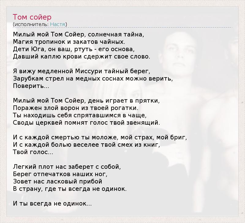 Милый мой Том Сойер, солнечная тайна, Магия тропинок и закатов чайных. Дети Юга, он ваш, ртуть - его основа, Давший каплю крови сдержит свое слово. Я вижу медленной Миссури тайный берег, Зарубкам стрел на медных соснах можно верить, Поверить... Милый мой Том Сойер, день играет в прятки, Поражен злой ворон из твоей рогатки. Ты находишь себя спрятавшимся в чаще, Своды церквей помнят голос твой звенящий. И с каждой смертью ты моложе, мой страх, мой бриг, И с каждой болью веселее твой смех из книг, Твой голос... Легкий плот нас заберет с собой, Берег отпечатков наших ног, Зовет нас ласковый прибой В страну, где ты всегда не одинок. И ты всегда не одинок...