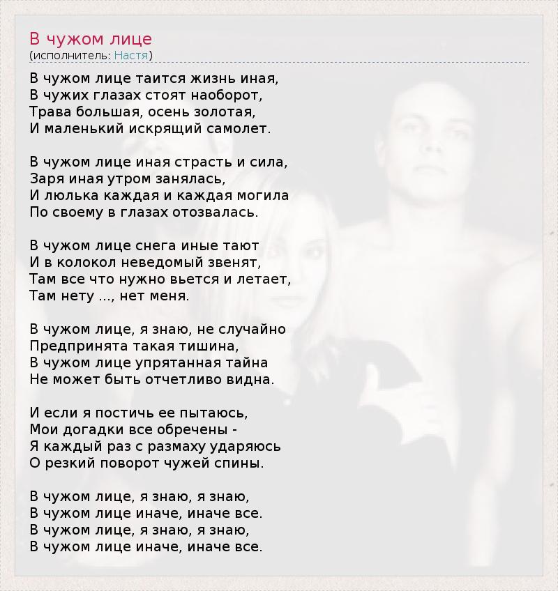 В чужом лице таится жизнь иная, В чужих глазах стоят наоборот, Трава большая, осень золотая, И маленький искрящий самолет. В чужом лице иная страсть и сила, Заря иная утром занялась, И люлька каждая и каждая могила По своему в глазах отозвалась. В чужом лице снега иные тают И в колокол неведомый звенят, Там все что нужно вьется и летает, Там нету ..., нет меня. В чужом лице, я знаю, не случайно Предпринята такая тишина, В чужом лице упрятанная тайна Не может быть отчетливо видна. И если я постичь ее пытаюсь, Мои догадки все обречены - Я каждый раз с размаху ударяюсь О резкий поворот чужей спины. В чужом лице, я знаю, я знаю, В чужом лице иначе, иначе все. В чужом лице, я знаю, я знаю, В чужом лице иначе, иначе все.