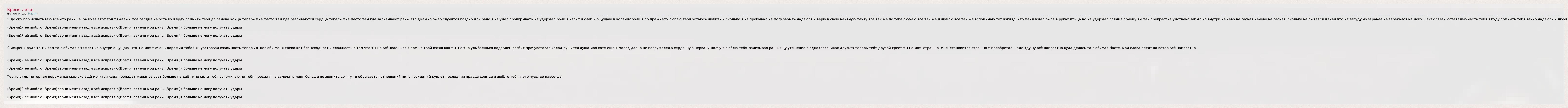 Я до сих пор испытываю всё что раньше было за этот год тяжёлый моё сердце не остыло я буду помнить тебя до самова конца теперь мне место там где разбиваются сердца теперь мне место там где зализывают раны это должно было случится поздно или рано я не умел проигрывать не удержал роли я избит и слаб и ощущаю в коленях боли я по прежнему люблю тебя остаюсь любить и сколько я не пробывал не могу забыть надеюся и верю в свою наивную мечту всё так же по тебе скучаю всё так же я люблю всё так же вспоминаю тот взгляд что меня ждал была в руках птица но не удержал солнце почему ты так прекрастна умствено забыл но внутри не чево не гаснет нечево не гаснет ,сколько не пытался я знал что не забуду но заранее не зарекался на моих щеках слёзы оставляею часть тебя я буду помнить тебя вечно надеюсь и любя (Время)Я её люблю (Время)верни меня назад я всё исправлю(Время) залечи мои раны (Время )я больше не могу получать удары (Время)Я её люблю (Время)верни меня назад я всё исправлю(Время) залечи мои раны (Время )я больше не могу получать удары Я искрени рад что ты кем то любимая с тяжестью внутри ощущаю что не моя я очень дорожил тобой я чувствовал взаимность теперь я нелюби меня тревожит безысходность сложность в том что ты не забываешься я помню твой взгял как ты нежно улыбаешься подавлен разбит прочувстовал холод рушится душа моя хотя ещё я молод давно не погружался в сердечную нервану молчу я люблю тебя зализывая раны ищу утешение в одноклассниках друзьях теперь тебя другой греет ты не моя страшно, мне становится страшно я преобретал надежду ну всё напрастно куда делась та любимая Настя мои слова летят на ветер всё напрастно... (Время)Я её люблю (Время)верни меня назад я всё исправлю(Время) залечи мои раны (Время )я больше не могу получать удары (Время)Я её люблю (Время)верни меня назад я всё исправлю(Время) залечи мои раны (Время )я больше не могу получать удары Теряю силы потерпел пороженье сколько ещё мучится када пропадёт желанье свет больше не даёт мне силы тебя вспоминаю но тебя просил я не замечать меня больше не звонить вот тут и обрывается отношений нить последний куплет последняя правда солнце я люблю тебя и это чувство навсегда (Время)Я её люблю (Время)верни меня назад я всё исправлю(Время) залечи мои раны (Время )я больше не могу получать удары (Время)Я её люблю (Время)верни меня назад я всё исправлю(Время) залечи мои раны (Время )я больше не могу получать удары