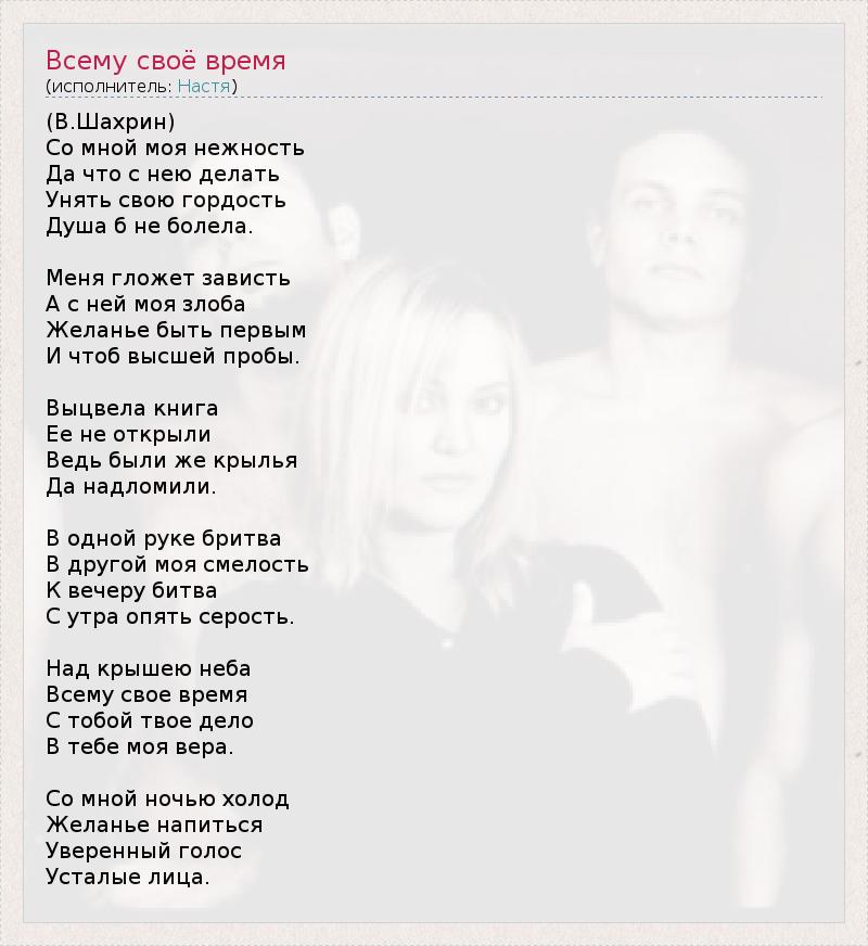 (В.Шахрин) Со мной моя нежность Да что с нею делать Унять свою гордость Душа б не болела. Меня гложет зависть А с ней моя злоба Желанье быть первым И чтоб высшей пробы. Выцвела книга Ее не открыли Ведь были же крылья Да надломили. В одной руке бритва В другой моя смелость К вечеру битва С утра опять серость. Над крышею неба Всему свое время С тобой твое дело В тебе моя вера. Со мной ночью холод Желанье напиться Уверенный голос Усталые лица.