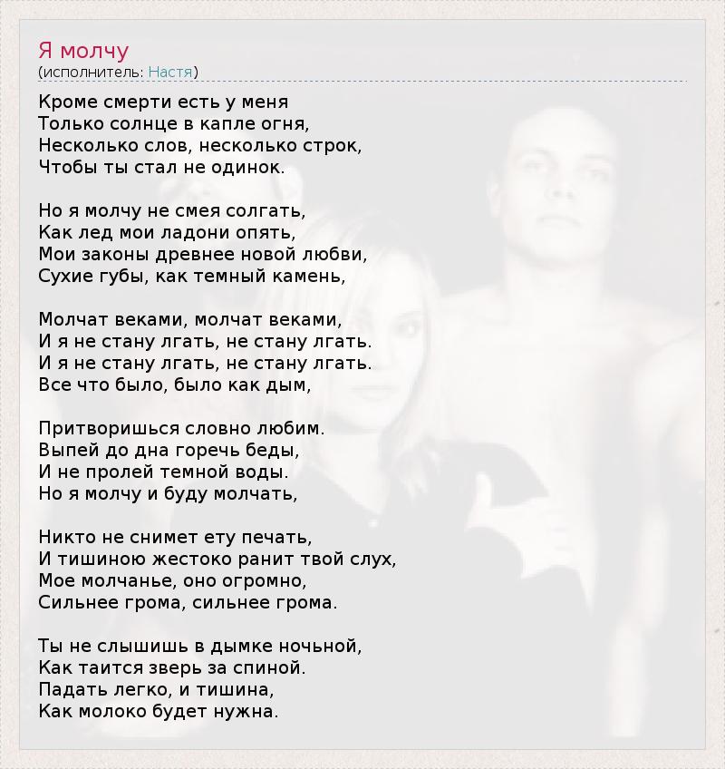 Кроме смерти есть у меня Только солнце в капле огня, Несколько слов, несколько строк, Чтобы ты стал не одинок. Но я молчу не смея солгать, Как лед мои ладони опять, Мои законы древнее новой любви, Сухие губы, как темный камень, Молчат веками, молчат веками, И я не стану лгать, не стану лгать. И я не стану лгать, не стану лгать. Все что было, было как дым, Притворишься словно любим. Выпей до дна горечь беды, И не пролей темной воды. Но я молчу и буду молчать, Никто не снимет ету печать, И тишиною жестоко ранит твой слух, Мое молчанье, оно огромно, Сильнее грома, сильнее грома. Ты не слышишь в дымке ночьной, Как таится зверь за спиной. Падать легко, и тишина, Как молоко будет нужна.