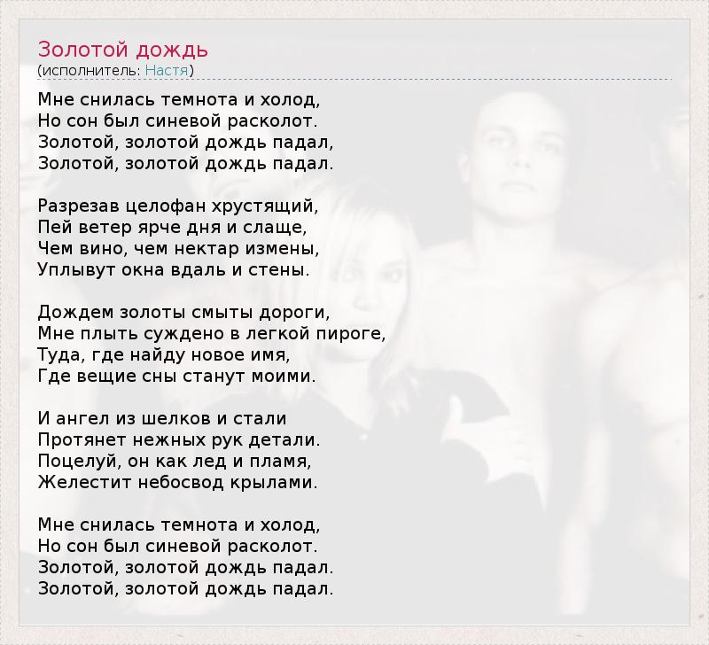 Мне снилась темнота и холод, Но сон был синевой расколот. Золотой, золотой дождь падал, Золотой, золотой дождь падал. Разрезав целофан хрустящий, Пей ветер ярче дня и слаще, Чем вино, чем нектар измены, Уплывут окна вдаль и стены. Дождем золоты смыты дороги, Мне плыть суждено в легкой пироге, Туда, где найду новое имя, Где вещие сны станут моими. И ангел из шелков и стали Протянет нежных рук детали. Поцелуй, он как лед и пламя, Желестит небосвод крылами. Мне снилась темнота и холод, Но сон был синевой расколот. Золотой, золотой дождь падал. Золотой, золотой дождь падал.
