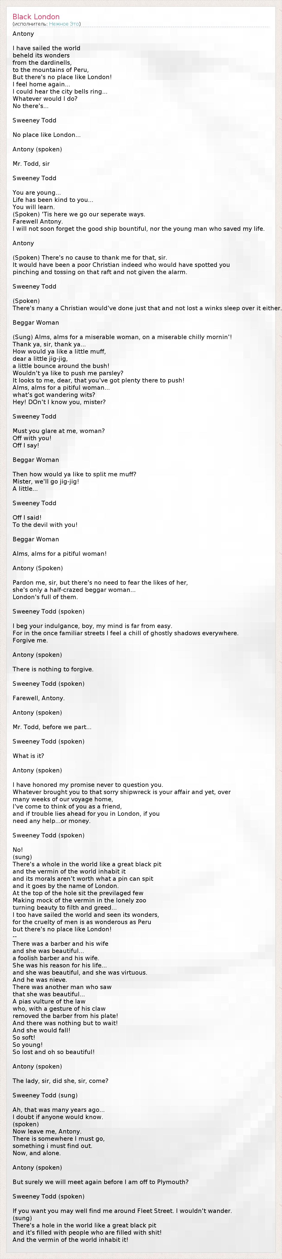 Antony I have sailed the world beheld its wonders from the dardinells, to the mountains of Peru, But there's no place like London! I feel home again... I could hear the city bells ring... Whatever would I do? No there's... Sweeney Todd No place like London... Antony (spoken) Mr. Todd, sir Sweeney Todd You are young... Life has been kind to you... You will learn. (Spoken) 'Tis here we go our seperate ways. Farewell Antony. I will not soon forget the good ship bountiful, nor the young man who saved my life. Antony (Spoken) There's no cause to thank me for that, sir. It would have been a poor Christian indeed who would have spotted you pinching and tossing on that raft and not given the alarm. Sweeney Todd (Spoken) There's many a Christian would've done just that and not lost a winks sleep over it either. Beggar Woman (Sung) Alms, alms for a miserable woman, on a miserable chilly mornin'! Thank ya, sir, thank ya... How would ya like a little muff, dear a little jig-jig, a little bounce around the bush! Wouldn't ya like to push me parsley? It looks to me, dear, that you've got plenty there to push! Alms, alms for a pitiful woman... what's got wandering wits? Hey! DOn't I know you, mister? Sweeney Todd Must you glare at me, woman? Off with you! Off I say! Beggar Woman Then how would ya like to split me muff? Mister, we'll go jig-jig! A little... Sweeney Todd Off I said! To the devil with you! Beggar Woman Alms, alms for a pitiful woman! Antony (Spoken) Pardon me, sir, but there's no need to fear the likes of her, she's only a half-crazed beggar woman... London's full of them. Sweeney Todd (spoken) I beg your indulgance, boy, my mind is far from easy. For in the once familiar streets I feel a chill of ghostly shadows everywhere. Forgive me. Antony (spoken) There is nothing to forgive. Sweeney Todd (spoken) Farewell, Antony. Antony (spoken) Mr. Todd, before we part... Sweeney Todd (spoken) What is it? Antony (spoken) I have honored my promise never to question you. Whatever brought you to that sorry shipwreck is your affair and yet, over many weeks of our voyage home, I've come to think of you as a friend, and if trouble lies ahead for you in London, if you need any help...or money. Sweeney Todd (spoken) No! (sung) There's a whole in the world like a great black pit and the vermin of the world inhabit it and its morals aren't worth what a pin can spit and it goes by the name of London. At the top of the hole sit the previlaged few Making mock of the vermin in the lonely zoo turning beauty to filth and greed... I too have sailed the world and seen its wonders, for the cruelty of men is as wonderous as Peru but there's no place like London! -- There was a barber and his wife and she was beautiful... a foolish barber and his wife. She was his reason for his life... and she was beautiful, and she was virtuous. And he was nieve. There was another man who saw that she was beautiful... A pias vulture of the law who, with a gesture of his claw removed the barber from his plate! And there was nothing but to wait! And she would fall! So soft! So young! So lost and oh so beautiful! Antony (spoken) The lady, sir, did she, sir, come? Sweeney Todd (sung) Ah, that was many years ago... I doubt if anyone would know. (spoken) Now leave me, Antony. There is somewhere I must go, something i must find out. Now, and alone. Antony (spoken) But surely we will meet again before I am off to Plymouth? Sweeney Todd (spoken) If you want you may well find me around Fleet Street. I wouldn't wander. (sung) There's a hole in the world like a great black pit and it's filled with people who are filled with shit! And the vermin of the world inhabit it!