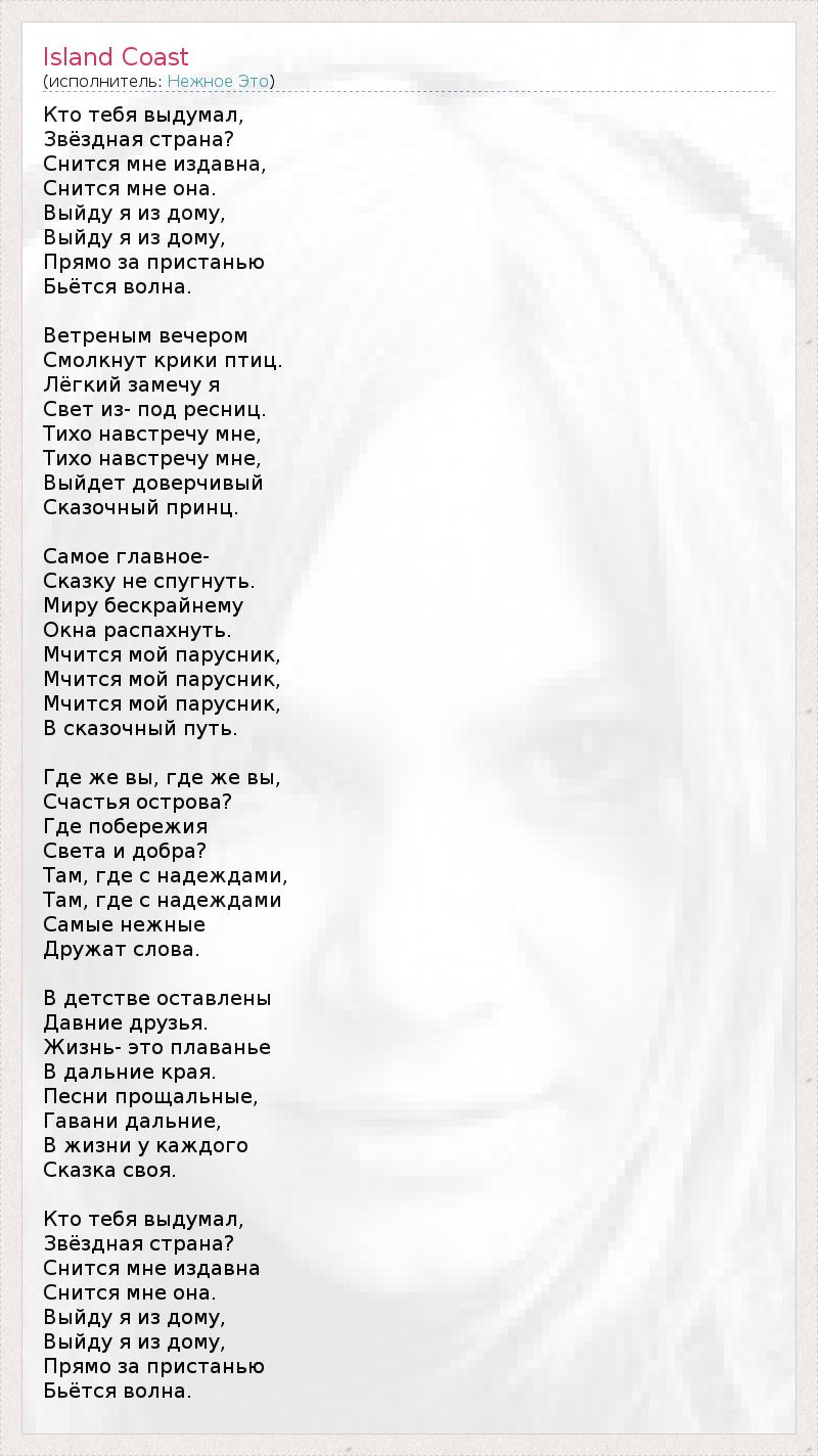 Кто тебя выдумал, Звёздная страна? Снится мне издавна, Снится мне она. Выйду я из дому, Выйду я из дому, Прямо за пристанью Бьётся волна. Ветреным вечером Смолкнут крики птиц. Лёгкий замечу я Свет из- под ресниц. Тихо навстречу мне, Тихо навстречу мне, Выйдет доверчивый Сказочный принц. Самое главное- Сказку не спугнуть. Миру бескрайнему Окна распахнуть. Мчится мой парусник, Мчится мой парусник, Мчится мой парусник, В сказочный путь. Где же вы, где же вы, Счастья острова? Где побережия Света и добра? Там, где с надеждами, Там, где с надеждами Самые нежные Дружат слова. В детстве оставлены Давние друзья. Жизнь- это плаванье В дальние края. Песни прощальные, Гавани дальние, В жизни у каждого Сказка своя. Кто тебя выдумал, Звёздная страна? Снится мне издавна Снится мне она. Выйду я из дому, Выйду я из дому, Прямо за пристанью Бьётся волна.