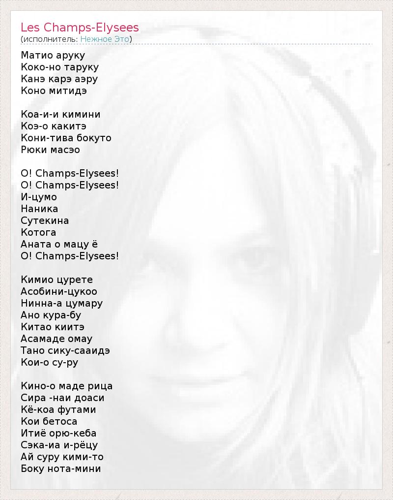 Мать аруку Коко- но Тарук Канэ карэ аэру Коно митидэ КоА - и- и кимины Коэ о какитэ Кони - тива бокуто Рюкы масэо O! Champs - Elysees ! O! Champs - Elysees ! И- цумо Наника Сутекина котого Аната в мацу е O! Champs - Elysees ! кими Цуре Асобины - цуко Нинна - а цумару Ано кура -бу Китай киитэ Асамаде омау Тано сику - сааидэ Кои о су- ру Кино о маде Рица Сырая - наи ДОАС Кё -КоА футов кои бетоса Итиё пашу - кэба Сэка - иа и- рёцу Ай суру кими - то Стороны нота - мини