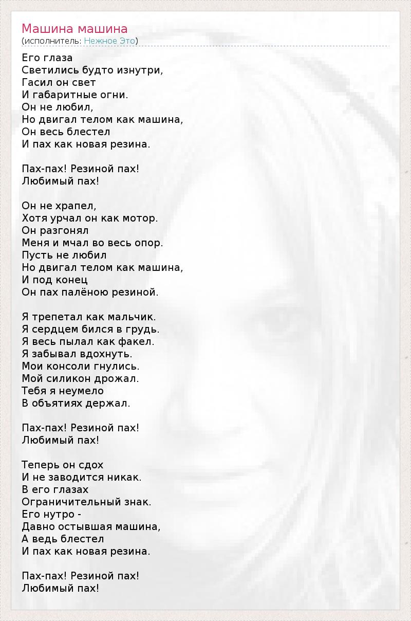 Его глаза Светились будто изнутри, Гасил он свет И габаритные огни. Он не любил, Но двигал телом как машина, Он весь блестел И пах как новая резина. Пах-пах! Резиной пах! Любимый пах! Он не храпел, Хотя урчал он как мотор. Он разгонял Меня и мчал во весь опор. Пусть не любил Но двигал телом как машина, И под конец Он пах палёною резиной. Я трепетал как мальчик. Я сердцем бился в грудь. Я весь пылал как факел. Я забывал вдохнуть. Мои консоли гнулись. Мой силикон дрожал. Тебя я неумело В объятиях держал. Пах-пах! Резиной пах! Любимый пах! Теперь он сдох И не заводится никак. В его глазах Ограничительный знак. Его нутро - Давно остывшая машина, А ведь блестел И пах как новая резина. Пах-пах! Резиной пах! Любимый пах!