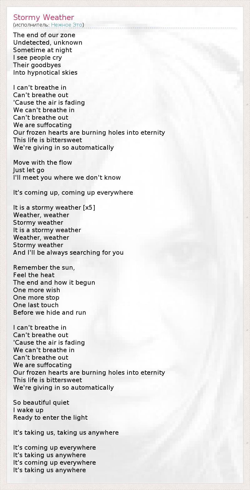 Границы нашей территории Не обнаружены, неизвестны. Иногда ночью Я вижу, как люди выкрикивают Прощальные слова В гипнотические небеса. Я не могу вдохнуть, Не могу выдохнуть, Потому что воздух улетучивается. Мы не можем вдохнуть, Не можем выдохнуть, Мы задыхаемся. Наши замерзшие сердца - это горящие дыры в бесконечность... Эта жизнь горько-сладкая, Мы сдаемся на автомате. Двигайся по течению, Просто отпусти. Я повстречаю тебя, но где, мы еще не знаем. Шторм приближается, приближается повсюду... Это штормовая погода, Погода, погода, Штормовая погода, Это штормовая погода, Погода, погода, Штормовая погода, И я всегда буду искать тебя. Помни солнце, Почувствуй жар, Конец и как это началось. Еще одно желание, Еще одна остановка, Одно последнее прикосновение До того, как мы убежим прятаться. Я не могу вдохнуть, Не могу выдохнуть, Потому что воздух улетучивается. Мы не можем вдохнуть, Не можем выдохнуть, Мы задыхаемся. Наши замерзшие сердца - это горящие дыры в бесконечность... Эта жизнь горько-сладкая, Мы сдаемся на автомате. Такая чудесная тишина... Я просыпаюсь, Готовый войти в поток света... Шторм настигнет нас, настигнет нас где угодно... Шторм приближается повсюду, Он настигнет нас где угодно... Шторм приближается повсюду, Он настигнет нас где угодно...