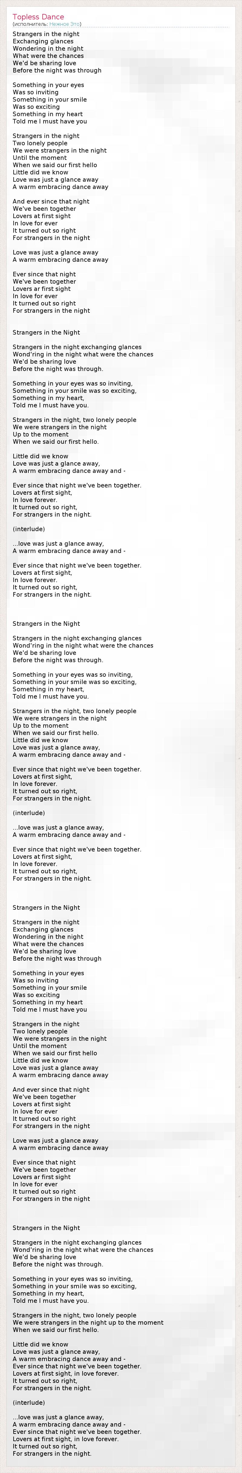 Strangers in the night Exchanging glances Wondering in the night What were the chances We'd be sharing love Before the night was through Something in your eyes Was so inviting Something in your smile Was so exciting Something in my heart Told me I must have you Strangers in the night Two lonely people We were strangers in the night Until the moment When we said our first hello Little did we know Love was just a glance away A warm embracing dance away And ever since that night We've been together Lovers at first sight In love for ever It turned out so right For strangers in the night Love was just a glance away A warm embracing dance away Ever since that night We've been together Lovers ar first sight In love for ever It turned out so right For strangers in the night Strangers in the Night Strangers in the night exchanging glances Wond'ring in the night what were the chances We'd be sharing love Before the night was through. Something in your eyes was so inviting, Something in your smile was so exciting, Something in my heart, Told me I must have you. Strangers in the night, two lonely people We were strangers in the night Up to the moment When we said our first hello. Little did we know Love was just a glance away, A warm embracing dance away and - Ever since that night we've been together. Lovers at first sight, In love forever. It turned out so right, For strangers in the night. (interlude) ...love was just a glance away, A warm embracing dance away and - Ever since that night we've been together. Lovers at first sight, In love forever. It turned out so right, For strangers in the night. Strangers in the Night Strangers in the night exchanging glances Wond'ring in the night what were the chances We'd be sharing love Before the night was through. Something in your eyes was so inviting, Something in your smile was so exciting, Something in my heart, Told me I must have you. Strangers in the night, two lonely people We were strangers in the night Up to the moment When we said our first hello. Little did we know Love was just a glance away, A warm embracing dance away and - Ever since that night we've been together. Lovers at first sight, In love forever. It turned out so right, For strangers in the night. (interlude) ...love was just a glance away, A warm embracing dance away and - Ever since that night we've been together. Lovers at first sight, In love forever. It turned out so right, For strangers in the night. Strangers in the Night Strangers in the night Exchanging glances Wondering in the night What were the chances We'd be sharing love Before the night was through Something in your eyes Was so inviting Something in your smile Was so exciting Something in my heart Told me I must have you Strangers in the night Two lonely people We were strangers in the night Until the moment When we said our first hello Little did we know Love was just a glance away A warm embracing dance away And ever since that night We've been together Lovers at first sight In love for ever It turned out so right For strangers in the night Love was just a glance away A warm embracing dance away Ever since that night We've been together Lovers ar first sight In love for ever It turned out so right For strangers in the night Strangers in the Night Strangers in the night exchanging glances Wond'ring in the night what were the chances We'd be sharing love Before the night was through. Something in your eyes was so inviting, Something in your smile was so exciting, Something in my heart, Told me I must have you. Strangers in the night, two lonely people We were strangers in the night up to the moment When we said our first hello. Little did we know Love was just a glance away, A warm embracing dance away and - Ever since that night we've been together. Lovers at first sight, in love forever. It turned out so right, For strangers in the night. (interlude) ...love was just a glance away, A warm embracing dance away and - Ever since that night we've been together. Lovers at first sight, in love forever. It turned out so right, For strangers in the night.