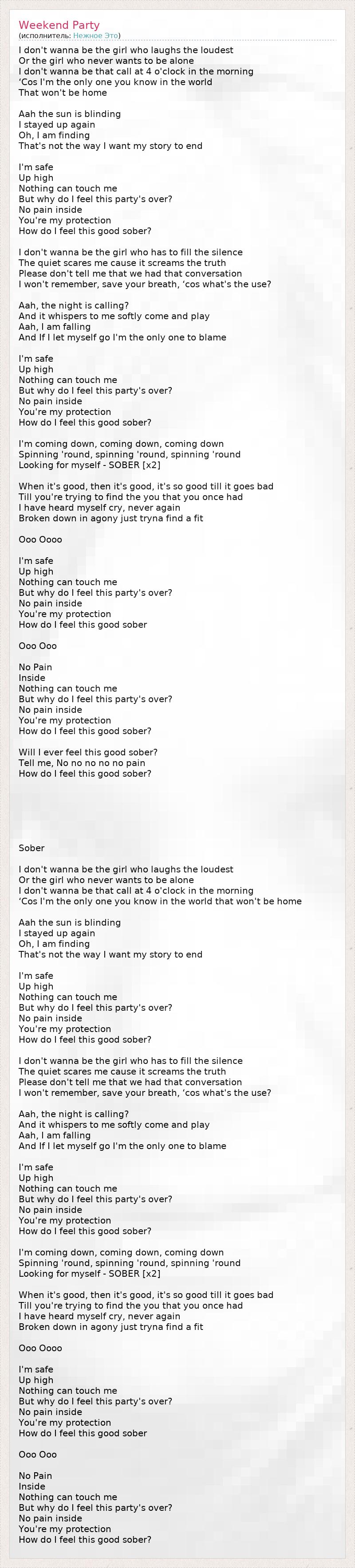 Я не хочу быть беззаботной и легкомысленной девчонкой, что смеется громче всех. Я не хочу быть девчонкой, что умирает от скуки, оставшись в одиночестве. Я не хочу быть для тебя тем "спасительным звонком" в 4 утра, Потому что я якобы "единственная, кого ты знаешь, Кто легко составит тебе компанию в такой час". Солнце слепит, Я опять не ложилась спать. И вдруг я понимаю, Что совсем не о таком конце своей истории я мечтала. Я в порядке, Мне хорошо. Ничто не может меня задеть. Но почему я чувствую, что эта вечеринка окончена? Я не чувствую боли, Ты – мой защитник, Почему я осознаю, что быть трезвой - так прекрасно? Я не хочу быть той, что боится остаться наедине со своими мыслями - Тишина пугает меня, потому что в ней кричит правда. Пожалуйста, не говори, что тот разговор на самом деле имел место. Я его не вспомню, лучше побереги слова, ведь какой в этом смысл? Ночь соблазняет меня, Она нежно шепчет мне: "Иди, поиграй". Я близка к падению, И если я поддамся ей, это будет лишь моя вина. Я в порядке, Мне хорошо. Ничто не может меня задеть. Но почему я чувствую, что эта вечеринка окончена? Я не чувствую боли, Ты – мой защитник, Почему я осознаю, что быть трезвой - так прекрасно? Я падаю, вниз вниз вниз… Перед глазами всё плывёт... Ищу себя… Трезвую… [2x] Когда все хорошо - это хорошо, пока все не станет плохо. Пока ты не начинаешь искать себя – ту, которой ты была раньше. Я помню, как плакала, этого больше не будет! Разбитая, в агонии, пытающаяся найти поддержку… О-о-о... Я в порядке, Мне хорошо. Ничто не может меня задеть. Но почему я чувствую, что эта вечеринка окончена? Я не чувствую боли, Ты – мой защитник, Почему я осознаю, что быть трезвой - так прекрасно? О-о-о... Я в порядке, Мне хорошо. Ничто не может меня задеть. Но почему я чувствую, что эта вечеринка окончена? Я не чувствую боли, Ты – мой защитник, Почему я осознаю, что быть трезвой - так прекрасно? Почувствую ли я и дальше, (Скажи мне... Нет, нет, нет боли...) Что быть трезвой - так прекрасно?? * Пинк написала эту песню во время вечеринки у неё дома, когда все были пьяны, и лишь она - нет, и ей хотелось чтобы все ушли. Она пошла проветриться на пляж, и в голове её звучал вопрос: "Почему я чувствую себя так хорошо трезвой? Почему мне так хорошо быть просто наедине с самой собой?" Трезвой (перевод Bonnie Mitch из Нижнего Новгорода) Я же не хочу для всех быть самой лучшей. Или самой яркой и общительной для всех. Не хочу, что бы ты знал, что я опять не дома Что кто-то слышит алкогольный смех. О-о-о горят звёзды Я опять всю ночь не сплю И теперь я понимаю Не хочу все это, это не люблю! Я здесь, Пьяна, И всё в порядке. Что же сейчас тянет меня в бездну? Без бед, И ты - моя защита. Буду ли я так смеяться трезвой? Не хочу быть той, то любит громкость. Но тишина правдива, я её боюсь. Нет не говори, что я тебе сказала. Лучше мне не знать и со спокойствием уснуть. Ночь зовёт меня и снова Говорит "Иди, и поиграй" Если всё же так будет. То вини меня, об этом так и знай! Я здесь, Пьяна, И всё в порядке. Что же сейчас тянет меня в бездну? Без бед, И ты - моя защита. Буду ли я так смеяться трезвой? Лечу вниз, лечу вниз, лечу вниз. Сотни лиц, сотни лиц, сотни лиц. Я ищу себя.. ТРЕЗВОЙ! [2 раза] Всё отлично, лишь пока всё хорошо. Лишь пока себя не ищешь ты ещё. Помню я, как много слёз я пролила.. На грани срыва, глупо так себя вела.. О-о-о.. Я здесь, Пьяна, И всё в порядке. Что же сейчас тянет меня в бездну? Без бе