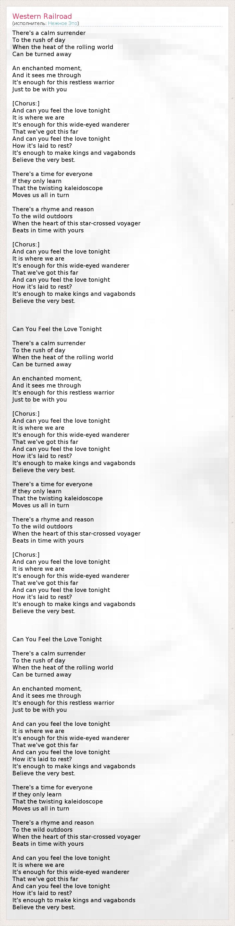 There's a calm surrender To the rush of day When the heat of the rolling world Can be turned away An enchanted moment, And it sees me through It's enough for this restless warrior Just to be with you [Chorus:] And can you feel the love tonight It is where we are It's enough for this wide-eyed wanderer That we've got this far And can you feel the love tonight How it's laid to rest? It's enough to make kings and vagabonds Believe the very best. There's a time for everyone If they only learn That the twisting kaleidoscope Moves us all in turn There's a rhyme and reason To the wild outdoors When the heart of this star-crossed voyager Beats in time with yours [Chorus:] And can you feel the love tonight It is where we are It's enough for this wide-eyed wanderer That we've got this far And can you feel the love tonight How it's laid to rest? It's enough to make kings and vagabonds Believe the very best. Can You Feel the Love Tonight There's a calm surrender To the rush of day When the heat of the rolling world Can be turned away An enchanted moment, And it sees me through It's enough for this restless warrior Just to be with you [Chorus:] And can you feel the love tonight It is where we are It's enough for this wide-eyed wanderer That we've got this far And can you feel the love tonight How it's laid to rest? It's enough to make kings and vagabonds Believe the very best. There's a time for everyone If they only learn That the twisting kaleidoscope Moves us all in turn There's a rhyme and reason To the wild outdoors When the heart of this star-crossed voyager Beats in time with yours [Chorus:] And can you feel the love tonight It is where we are It's enough for this wide-eyed wanderer That we've got this far And can you feel the love tonight How it's laid to rest? It's enough to make kings and vagabonds Believe the very best. Can You Feel the Love Tonight There's a calm surrender To the rush of day When the heat of the rolling world Can be turned away An enchanted moment, And it sees me through It's enough for this restless warrior Just to be with you And can you feel the love tonight It is where we are It's enough for this wide-eyed wanderer That we've got this far And can you feel the love tonight How it's laid to rest? It's enough to make kings and vagabonds Believe the very best. There's a time for everyone If they only learn That the twisting kaleidoscope Moves us all in turn There's a rhyme and reason To the wild outdoors When the heart of this star-crossed voyager Beats in time with yours And can you feel the love tonight It is where we are It's enough for this wide-eyed wanderer That we've got this far And can you feel the love tonight How it's laid to rest? It's enough to make kings and vagabonds Believe the very best.