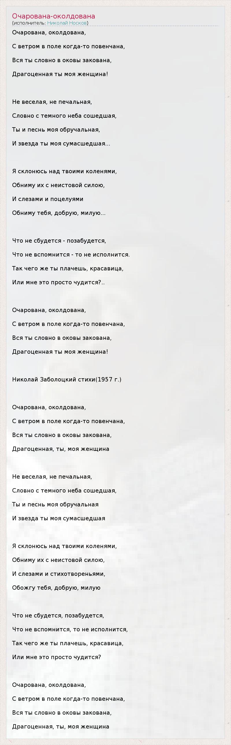 Очарована, околдована, С ветром в поле когда-то повенчана, Вся ты словно в оковы закована, Драгоценная ты моя женщина! Не веселая, не печальная, Словно с темного неба сошедшая, Ты и песнь моя обручальная, И звезда ты моя сумасшедшая... Я склонюсь над твоими коленями, Обниму их с неистовой силою, И слезами и поцелуями Обниму тебя, добрую, милую... Что не сбудется - позабудется, Что не вспомнится - то не исполнится. Так чего же ты плачешь, красавица, Или мне это просто чудится?.. Очарована, околдована, С ветром в поле когда-то повенчана, Вся ты словно в оковы закована, Драгоценная ты моя женщина! Николай Заболоцкий стихи(1957 г.) Очарована, околдована, С ветром в поле когда-то повенчана, Вся ты словно в оковы закована, Драгоценная, ты, моя женщина Не веселая, не печальная, Словно с темного неба сошедшая, Ты и песнь моя обручальная И звезда ты моя сумасшедшая Я склонюсь над твоими коленями, Обниму их с неистовой силою, И слезами и стихотвореньями, Обожгу тебя, добрую, милую Что не сбудется, позабудется, Что не вспомнится, то не исполнится, Так чего же ты плачешь, красавица, Или мне это просто чудится? Очарована, околдована, С ветром в поле когда-то повенчана, Вся ты словно в оковы закована, Драгоценная, ты, моя женщина