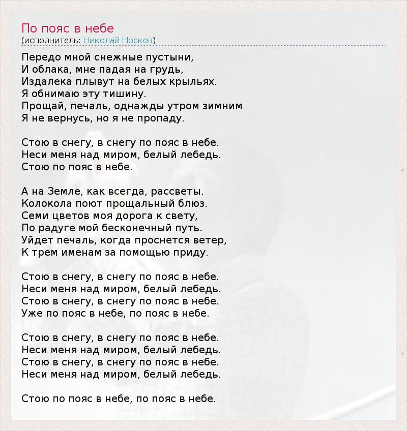 Передо мной снежные пустыни, И облака, мне падая на грудь, Издалека плывут на белых крыльях. Я обнимаю эту тишину. Прощай, печаль, однажды утром зимним Я не вернусь, но я не пропаду. Стою в снегу, в снегу по пояс в небе. Неси меня над миром, белый лебедь. Стою по пояс в небе. А на Земле, как всегда, рассветы. Колокола поют прощальный блюз. Семи цветов моя дорога к свету, По радуге мой бесконечный путь. Уйдет печаль, когда проснется ветер, К трем именам за помощью приду. Стою в снегу, в снегу по пояс в небе. Неси меня над миром, белый лебедь. Стою в снегу, в снегу по пояс в небе. Уже по пояс в небе, по пояс в небе. Стою в снегу, в снегу по пояс в небе. Неси меня над миром, белый лебедь. Стою в снегу, в снегу по пояс в небе. Неси меня над миром, белый лебедь. Стою по пояс в небе, по пояс в небе.