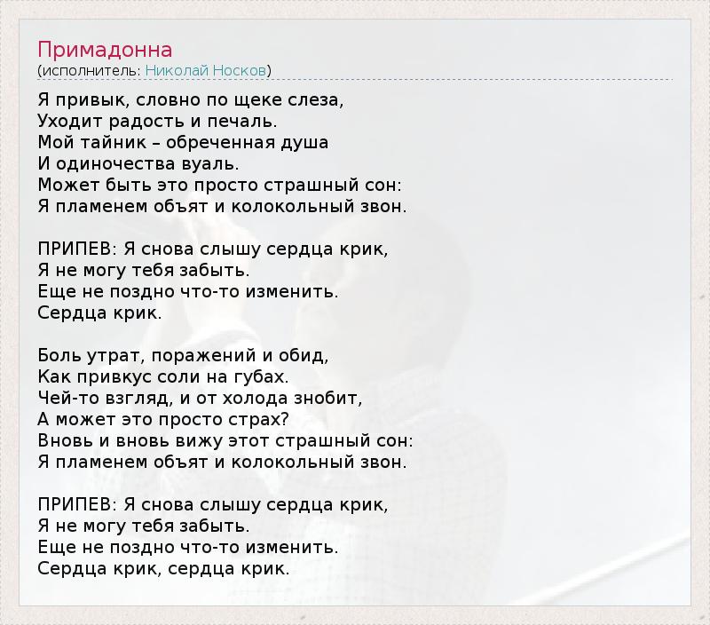 Я привык, словно по щеке слеза, Уходит радость и печаль. Мой тайник – обреченная душа И одиночества вуаль. Может быть это просто страшный сон: Я пламенем объят и колокольный звон. ПРИПЕВ: Я снова слышу сердца крик, Я не могу тебя забыть. Еще не поздно что-то изменить. Сердца крик. Боль утрат, поражений и обид, Как привкус соли на губах. Чей-то взгляд, и от холода знобит, А может это просто страх? Вновь и вновь вижу этот страшный сон: Я пламенем объят и колокольный звон. ПРИПЕВ: Я снова слышу сердца крик, Я не могу тебя забыть. Еще не поздно что-то изменить. Сердца крик, сердца крик.