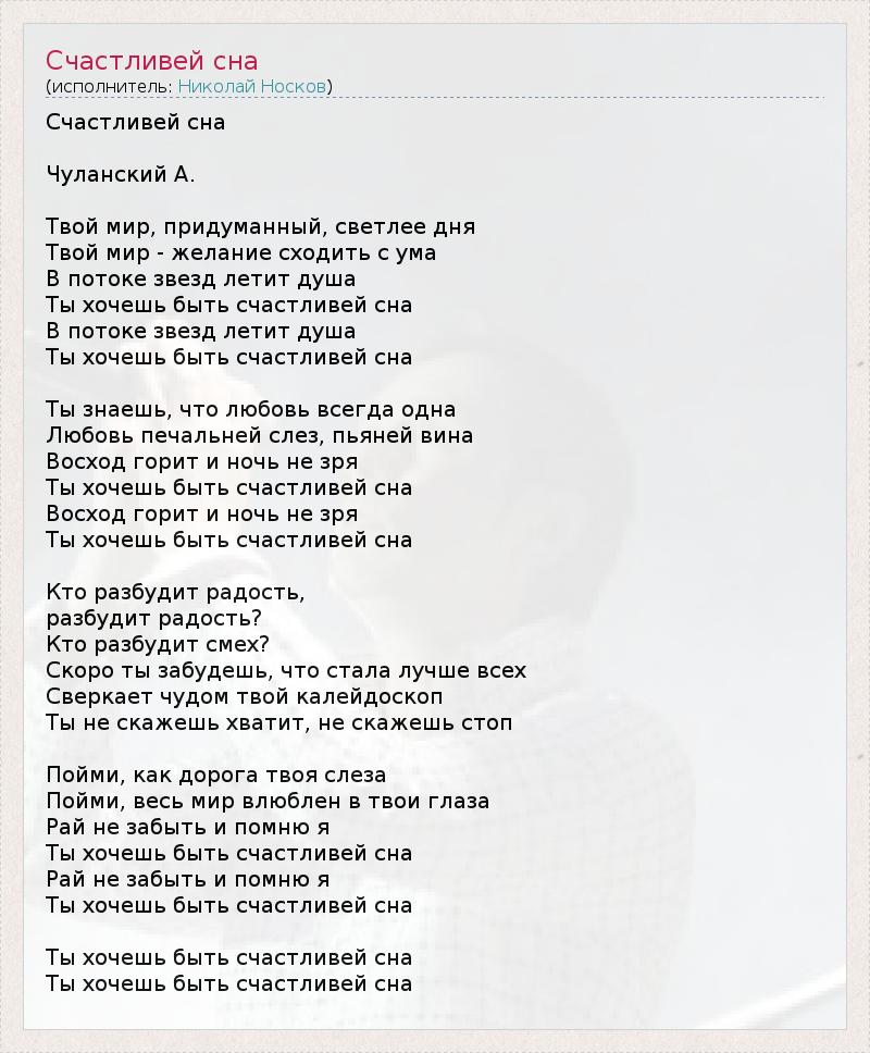 Счастливей сна Чуланский А. Твой мир, придуманный, светлее дня Твой мир - желание сходить с ума В потоке звезд летит душа Ты хочешь быть счастливей сна В потоке звезд летит душа Ты хочешь быть счастливей сна Ты знаешь, что любовь всегда одна Любовь печальней слез, пьяней вина Восход горит и ночь не зря Ты хочешь быть счастливей сна Восход горит и ночь не зря Ты хочешь быть счастливей сна Кто разбудит радость, разбудит радость? Кто разбудит смех? Скоро ты забудешь, что стала лучше всех Сверкает чудом твой калейдоскоп Ты не скажешь хватит, не скажешь стоп Пойми, как дорога твоя слеза Пойми, весь мир влюблен в твои глаза Рай не забыть и помню я Ты хочешь быть счастливей сна Рай не забыть и помню я Ты хочешь быть счастливей сна Ты хочешь быть счастливей сна Ты хочешь быть счастливей сна