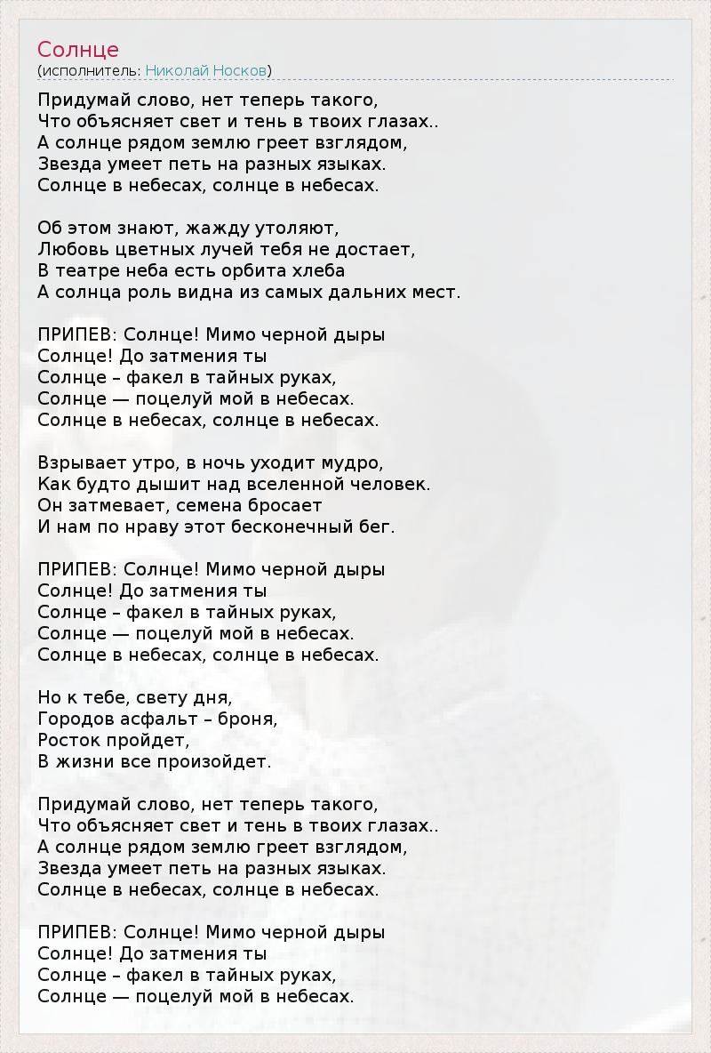 Придумай слово, нет теперь такого, Что объясняет свет и тень в твоих глазах.. А солнце рядом землю греет взглядом, Звезда умеет петь на разных языках. Солнце в небесах, солнце в небесах. Об этом знают, жажду утоляют, Любовь цветных лучей тебя не достает, В театре неба есть орбита хлеба А солнца роль видна из самых дальних мест. ПРИПЕВ: Солнце! Мимо черной дыры Солнце! До затмения ты Солнце – факел в тайных руках, Солнце — поцелуй мой в небесах. Солнце в небесах, солнце в небесах. Взрывает утро, в ночь уходит мудро, Как будто дышит над вселенной человек. Он затмевает, семена бросает И нам по нраву этот бесконечный бег. ПРИПЕВ: Солнце! Мимо черной дыры Солнце! До затмения ты Солнце – факел в тайных руках, Солнце — поцелуй мой в небесах. Солнце в небесах, солнце в небесах. Но к тебе, свету дня, Городов асфальт – броня, Росток пройдет, В жизни все произойдет. Придумай слово, нет теперь такого, Что объясняет свет и тень в твоих глазах.. А солнце рядом землю греет взглядом, Звезда умеет петь на разных языках. Солнце в небесах, солнце в небесах. ПРИПЕВ: Солнце! Мимо черной дыры Солнце! До затмения ты Солнце – факел в тайных руках, Солнце — поцелуй мой в небесах.