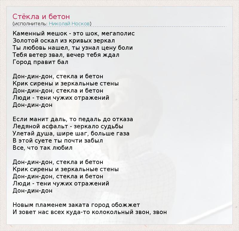 Каменный мешок - это шок, мегаполис Золотой оскал из кривых зеркал Ты любовь нашел, ты узнал цену боли Тебя ветер звал, вечер тебя ждал Город правит бал Дон-дин-дон, стекла и бетон Крик сирены и зеркальные стены Дон-дин-дон, стекла и бетон Люди - тени чужих отражений Дон-дин-дон Если манит даль, то педаль до отказа Ледяной асфальт - зеркало судьбы Улетай душа, шире шаг, больше газа В этой суете ты почти забыл Все, что так любил Дон-дин-дон, стекла и бетон Крик сирены и зеркальные стены Дон-дин-дон, стекла и бетон Люди - тени чужих отражений Дон-дин-дон Новым пламенем заката город обожжет И зовет нас всех куда-то колокольный звон, звон