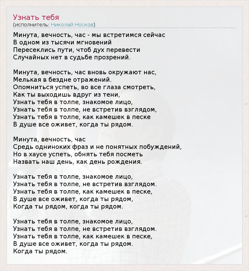 Минута, вечность, час - мы встретимся сейчас В одном из тысячи мгновений Пересеклись пути, чтоб дух перевести Случайных нет в судьбе прозрений. Минута, вечность, час вновь окружают нас, Мелькая в бездне отражений. Опомниться успеть, во все глаза смотреть, Как ты выходишь вдруг из тени, Узнать тебя в толпе, знакомое лицо, Узнать тебя в толпе, не встретив взглядом, Узнать тебя в толпе, как камешек в песке В душе все оживет, когда ты рядом. Минута, вечность, час Средь одниноких фраз и не понятных побуждений, Но в хаусе успеть, обнять тебя посметь Назвать наш день, как день рождения. Узнать тебя в толпе, знакомое лицо, Узнать тебя в толпе, не встретив взглядом. Узнать тебя в толпе, как камешек в песке, В душе все оживет, когда ты рядом, Когда ты рядом, когда ты рядом. Узнать тебя в толпе, знакомое лицо, Узнать тебя в толпе, не встретив взглядом. Узнать тебя в толпе, как камешек в песке, В душе все оживет, когда ты рядом. Когда ты рядом.