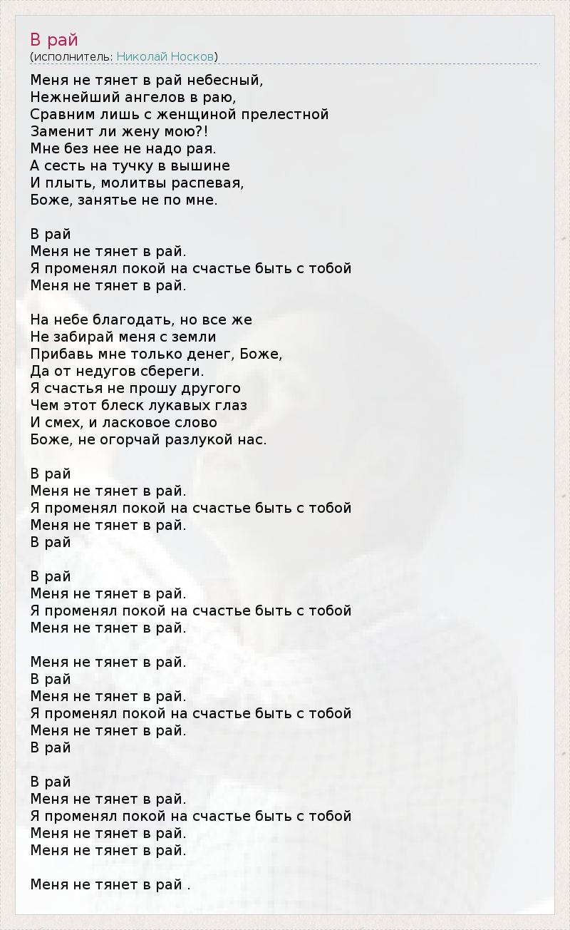 Меня не тянет в рай небесный, Нежнейший ангелов в раю, Сравним лишь с женщиной прелестной Заменит ли жену мою?! Мне без нее не надо рая. А сесть на тучку в вышине И плыть, молитвы распевая, Боже, занятье не по мне. В рай Меня не тянет в рай. Я променял покой на счастье быть с тобой Меня не тянет в рай. На небе благодать, но все же Не забирай меня с земли Прибавь мне только денег, Боже, Да от недугов сбереги. Я счастья не прошу другого Чем этот блеск лукавых глаз И смех, и ласковое слово Боже, не огорчай разлукой нас. В рай Меня не тянет в рай. Я променял покой на счастье быть с тобой Меня не тянет в рай. В рай В рай Меня не тянет в рай. Я променял покой на счастье быть с тобой Меня не тянет в рай. Меня не тянет в рай. В рай Меня не тянет в рай. Я променял покой на счастье быть с тобой Меня не тянет в рай. В рай В рай Меня не тянет в рай. Я променял покой на счастье быть с тобой Меня не тянет в рай. Меня не тянет в рай. Меня не тянет в рай .